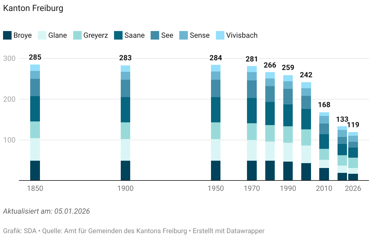 Der Kanton Freiburg reorganisiert seine Gemeinden durch Gemeindefusionen. So ist die Zahl der Gemeinden von 285 im Jahr 1850 auf 119 im Jahr 2026 geschrumpft. Ab 2000 nahmen die Gemeindefusionen stark zu, wobei der Spitzenwert im Jahr 2003 erreicht wurde, als 21 Gemeinden verschwanden. Gegenüber 1850 zählt der Glanebezirk derzeit 41 Gemeinden weniger, auf ihn folgt der Saane- (-37), der Broye- (-32), der See- (-29), der Greyerz- (-16), der Vivisbach- (-7) und der Sensebezirk (-4). Im Jahr 1923 entwickelte sich der Sensebezirk sogar gegen den allgemeinen Trend, als sich Schmitten von Düdingen trennte, um eine eigenständige Gemeinde zu werden.