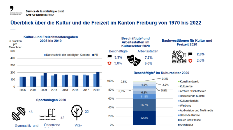 Die Freiburger Staatsausgaben für Kultur und Freizeit fielen im Jahr 2019 grosszügiger aus als im restlichen Beobachtungszeitraum (ab 2005). Diese Ausgaben lagen auch über dem Durchschnitt der anderen Kantone, die an dieser Erhebung teilnehmen. Im Jahr 2020 beliefen sich die Investitionen in Bauprojekte für Kultur und Freizeit auf 2,8 % aller Bauinvestitionen im Kanton Freiburg. Dieser Betrag fiel etwas höher aus als im Schweizer Durchschnitt, der bei 2,6 % lag. Die für Kultur und Freizeit ausgestellten Baubewilligungen entsprachen 2,8 % aller im Jahr 2021 im Kanton Freiburg erteilten Baubewilligungen. 45,4 % dieser Bauten betrafen den Saanebezirk.