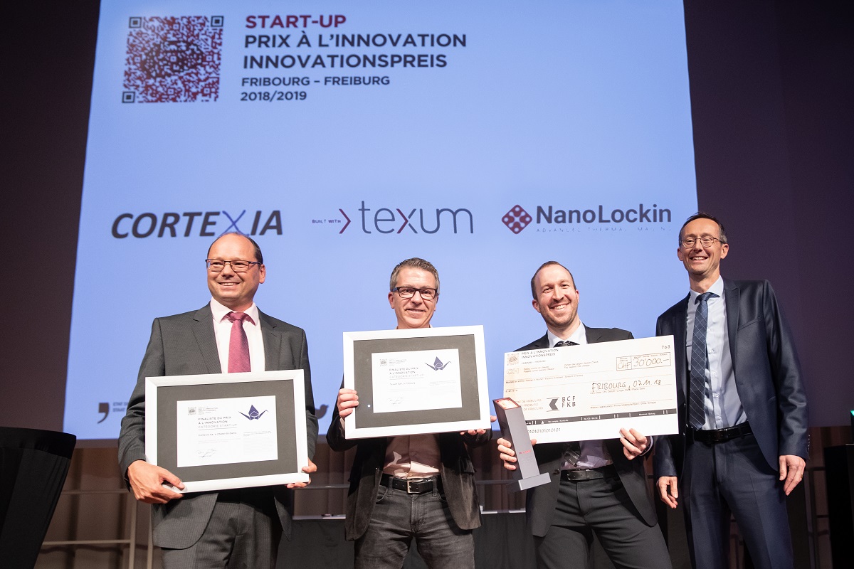 Le Prix Start-up, doté de 30ʼ000 francs a été remis par le Conseiller d’Etat Olivier Curty, Président du jury du Prix à l’innovation du canton de Fribourg. Les sociétés Cortexia à Châtel-St-Denis et Texum à Fribourg se sont classées deuxième et troisième.