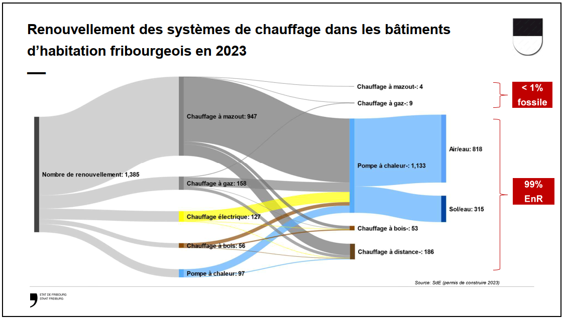 L’an passé, 99% des 1400 systèmes de chauffages remplacés dans les bâtiments d’habitation du canton ont fait place à des systèmes à énergies renouvelables, essentiellement des pompes à chaleur. Dans le détail, il s’agit de 1005 chauffages aux énergies fossiles émettrices de CO2, dont 947 chauffages à mazout et 158 chauffages à gaz, mais aussi de 127 chauffages électriques, particulièrement énergivores et peu efficaces. Le reste des systèmes de chauffage remplacés concerne des installations à bois ou des pompes à chaleur arrivées en fin de vie, soit une vingtaine d’années après leur mise en service.