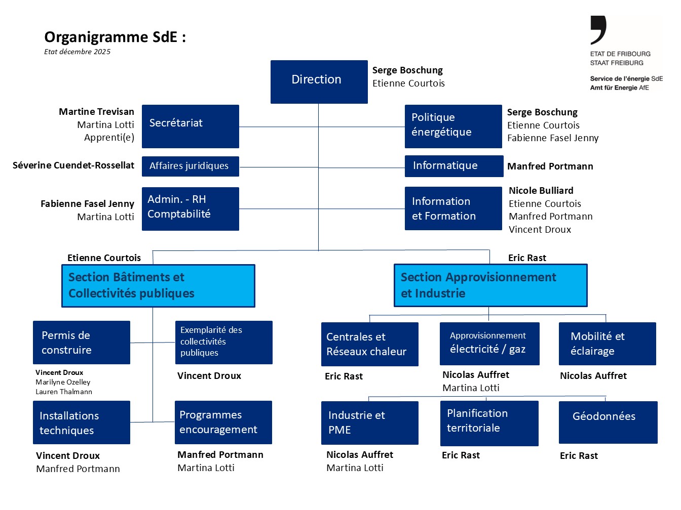 Accueil Direction de l’économie, de l’emploi et de la formation professionnelle Service de l'énergie Organigramme du Service de l'énergie Organigramme du Service de l'énergie Chapeau Organisation du Service Agrandir Organigramme SdE décembre 2025 © Etat de Fribourg - Staat Freiburg Documents liés Organigramme SdE décembre 2025 PDF, 147.38k Service de l'énergie Communes : politique énergétique Formation et information dans le domaine de l’énergie Gros consommateurs Permis de construire - Energie Politique énergétique, planification et approvisionnement en énergie Programmes de subventions en matière d'énergie Direction / Service propriétaire Service de l'énergie Information de contact Directions / Services associés Service de l'énergie Information de contact Publié par Service de l'énergie Dernière modification : 01.12.2025 Partager sur :