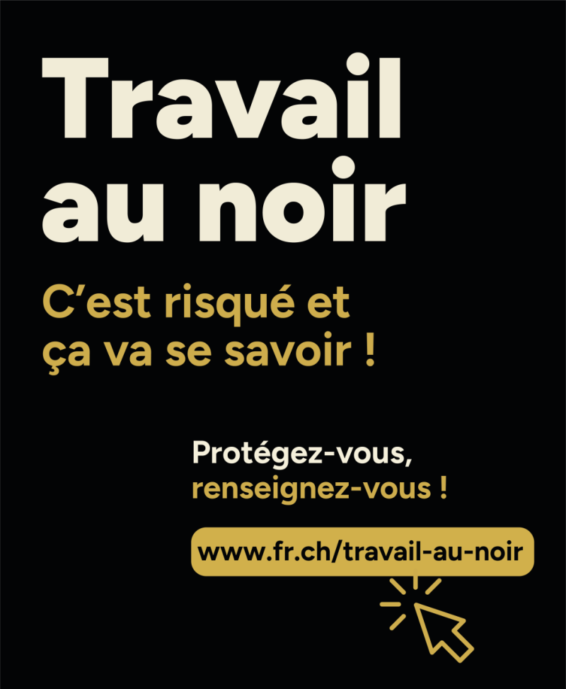« Le travail au noir, c’est risqué et ça va se savoir ! » : campagne de communicationLa répression ne saurait constituer l’unique instrument de lutte contre le travail au noir, dommageable pour tous : collectivités publiques, entreprises, employé-e-s. Le SPE lance une nouvelle campagne d’information et de sensibilisation intitulée « Le travail au noir, c’est risqué et ça va se savoir ! ». Elle se focalisera sur les risques à recourir au travail au noir et se déclinera sous plusieurs formes : une page dédiée sur le site de l’Etat de Fribourg (fr.ch/travail-au-noir), des vidéos diffusées sur les réseaux sociaux, des annonces dans la presse ou encore un travail d’information en étroite collaboration avec les associations faîtières du canton.