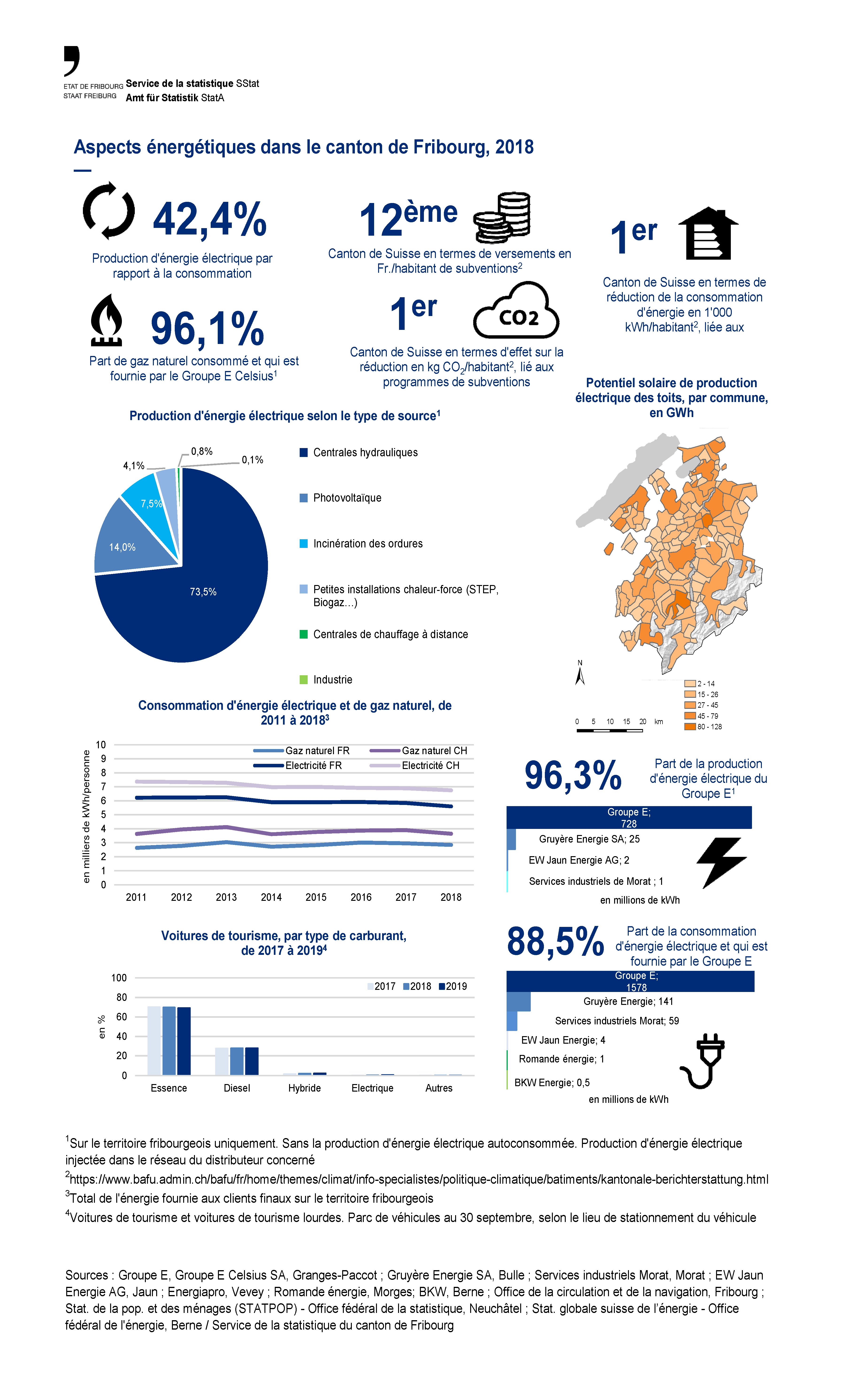 42,4% de l’énergie électrique consommée est produite dans le canton de Fribourg. La principale source de production d’énergie électrique reste les centrales hydrauliques (73,5%), suivent le photovoltaïque (14,0%) et l’incinération des ordures (7,5%). Les petites installations chaleur-forces (STEP, Biogaz…), les centrales de chauffage à distance et l’industrie représentent des parts encore insignifiantes. Le Groupe E est le leader en termes de production d’énergie électrique dans le canton. Sa part de production atteint les 96,3%. Les autres acteurs, tel que Gruyère Energie SA, EW Jaun Energie et les services industriels de Morat, ne couvrent qu’une petite part du marché. Le Groupe E domine aussi sur le plan de la distribution d’énergie électrique. En effet, il fournit 88,5% de l’énergie qui est consommée dans le canton. Le Groupe E Celsius fournit 96,1% du gaz naturel consommé dans le canton. Au cours des huit dernières années, on observe un léger fléchissement de la consommation d’énergie électrique par habitant, que ce soit en Suisse ou dans le canton de Fribourg, ce dernier ayant toujours eu une consommation plus faible par rapport au niveau national. L’évolution du gaz naturel est un peu plus instable mais présente une baisse depuis 2017 au niveau Suisse. Le canton de Fribourg présente là-aussi une consommation inférieure à la moyenne suisse avec, à quelques exceptions près, un trend similaire à celui de la Suisse.