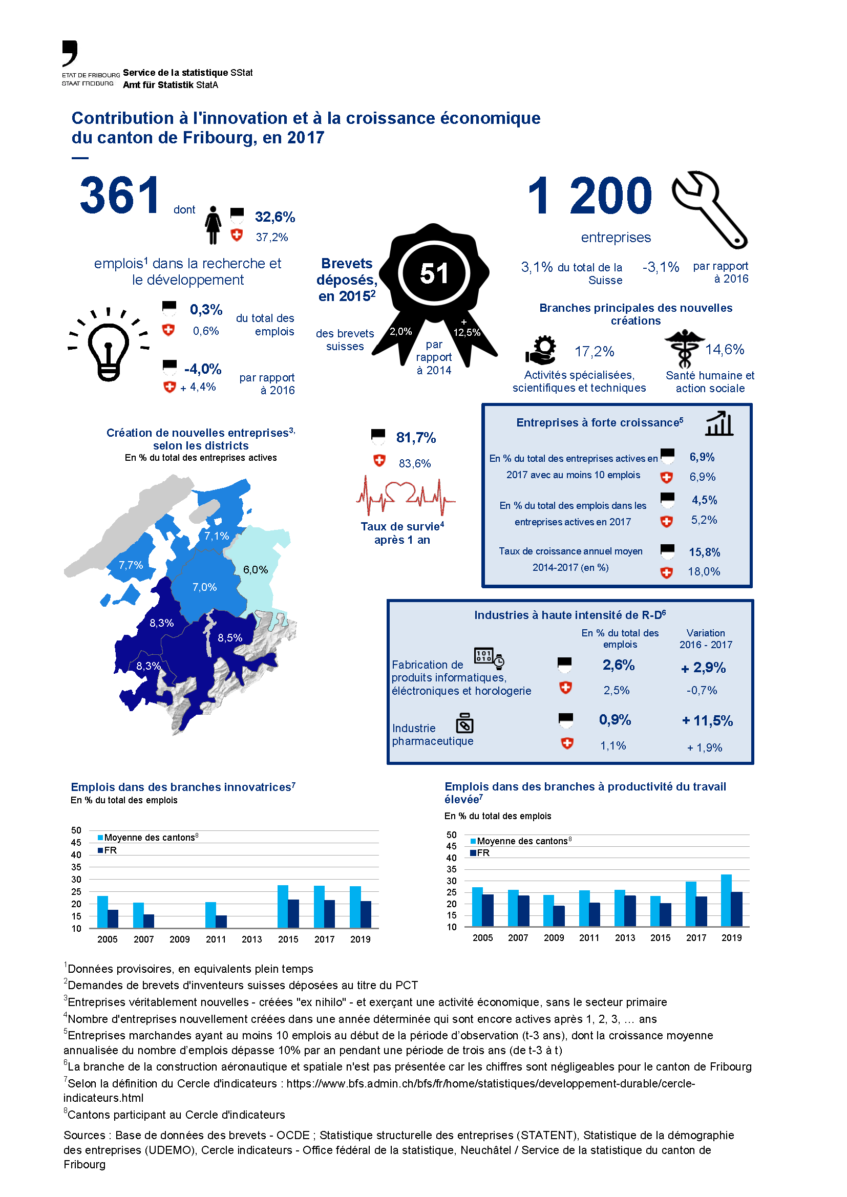 1'200 nouvelles entreprises créées "ex nihilo" ont vu le jour, soit 38 de moins qu'en 2016 (-3,1%). Cela représente 3,1% des nouvelles créations en Suisse. Les principales branches concernées par de nouvelles créations sont les activités spécialisées scientifiques et techniques, la santé humaine et l’action sociale. Les nouvelles créations se concentrent majoritairement dans le district de la Gruyère (8,5%), de la Veveyse (8,3%) et de la Glâne (8,3%) lorsque l’on compare le nombre de créations au total des entreprises actives dans ces districts. Les districts qui présentent, a priori, moins de dynamisme dans ce domaine sont la Sarine (7,0%) et la Singine (6,0%). Ces nouvelles entreprises doivent lutter pour leur survie. Ainsi, plus de quatre entreprises sur cinq créées en 2016 étaient encore actives après une année, tandis que le taux de survie des nouvelles créations de 2014 chute à 55,4% après 3 ans.