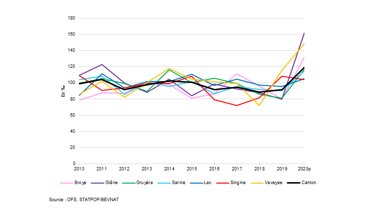 Toutefois, si on ramène le nombre des décès à l’effectif de la même tranche d’âges par mille habitants pour chaque district, soit leur taux spécifique de mortalité, les districts de la Glâne, Veveyse et Broye sont les plus touchés. Dans le Lac, l’incidence de la Covid-19 a été relativement modérée et en Singine, le taux spécifique a même été un peu plus faible en 2020 qu’en 2019.