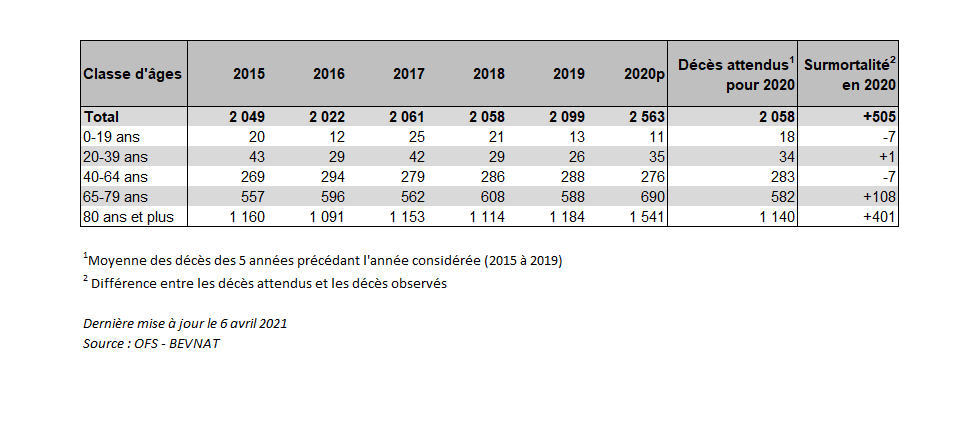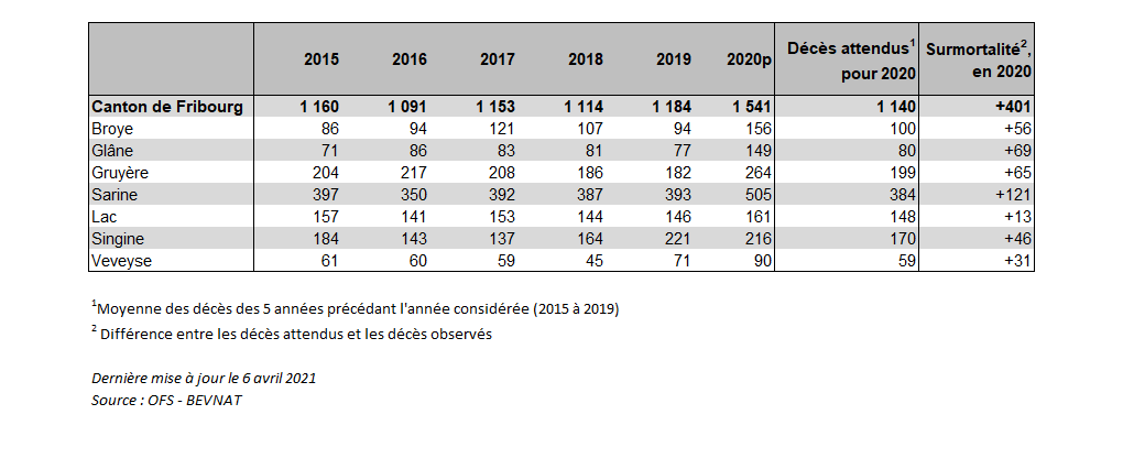 Comme pour le reste de la Suisse, le canton de Fribourg constate un nombre anormalement élevé de décès chez ses habitant-e-s pour l’année 2020. En comparant les décès attendus pour 2020 (moyenne des décès des 5 années précédentes) avec ceux observés, on remarque une surmortalité d’un peu plus de 500 personnes. La Covid-19 a particulièrement sévi chez nos aîné-e-s. Les personnes âgées de 80 ans et plus paient le plus lourd tribut avec 400 décès supplémentaires par rapport à ce qu’on pouvait s’attendre, soit les 80% de la totalité de la surmortalité constatée au niveau du canton.