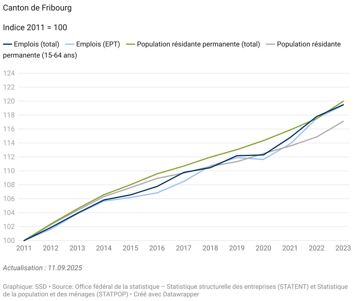2011-2023 : l’emploi fribourgeois suit le rythme de la croissance démographique