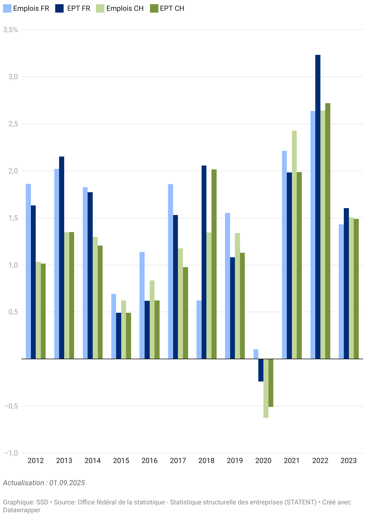 Selon les résultats de la dernière statistique structurelle des entreprises (STATENT), on dénombrait fin 2023 166'675 emplois dans le canton de Fribourg, correspondant à 126'970 équivalents plein temps (EPT). Par rapport à 2022, cela représente une augmentation de 2005 EPT, soit une hausse de 1,6%, marquant un ralentissement par rapport aux fortes croissances post-COVID 2021 (+2,0%) et 2022 (+3,2%). La croissance de l’emploi fribourgeois en 2023 reste toutefois légèrement supérieure à celle observée au niveau national (+1,5%).