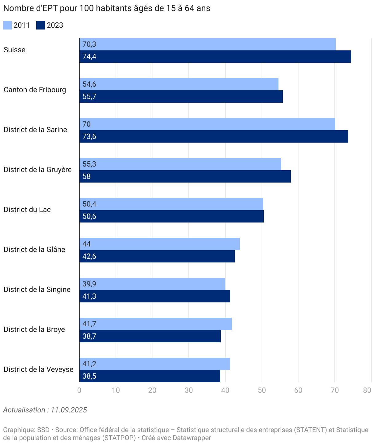 La densité de l’emploi, exprimée en nombre d’EPT pour 100 habitants de 15 à 64 ans, a par conséquent légèrement augmenté dans le canton entre 2011 et 2023, passant de 54,6 à 55,7. Elle reste néanmoins nettement inférieure à la moyenne nationale (74,4), Fribourg se situant en queue de classement des cantons, loin derrière Zoug (119,5) et Bâle-Ville (116,6).
