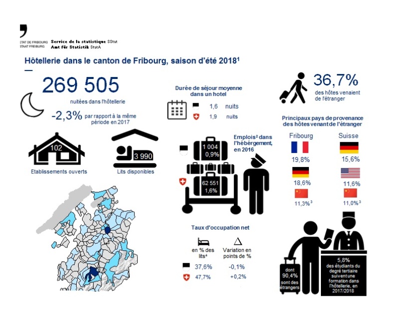 L’hôtellerie dans le canton de Fribourg a enregistré un bilan mitigé au cours de la saison touristique d’été (mai 2018 à octobre 2018) avec 269’505 nuitées soit un recul de 2,3% (-6’353) par rapport à la même période de l’année précédente. On recense en tout, 102 établissements ouverts et 3’990 lits disponibles. Pendant cette période, les plus fortes baisses ont été enregistrées pendant les mois de juillet et d’août. Seul juin et octobre affichent une performance légèrement meilleure que celle de 2017. Durant la saison touristique d’été, un hôte sur trois provenait de l’étranger avec, en tête du classement, des clients européens venant de France et d’Allemagne, suivis de près par des touristes chinois. Un hôte sur trois a privilégié des établissements à quatre étoiles. La durée de séjour moyenne dans un hôtel s’élève à 1,6 nuits, valeur plus faible que celle Suisse qui se situe à 1,9 nuits. Fribourg ville reste la destination plus prisée, suivie des communes de Bulle et Morat. En termes d’emplois, la branche de l’hébergement représente 0,9% des emplois totaux, contre 1,6% en Suisse (chiffres provisoires de 2016).