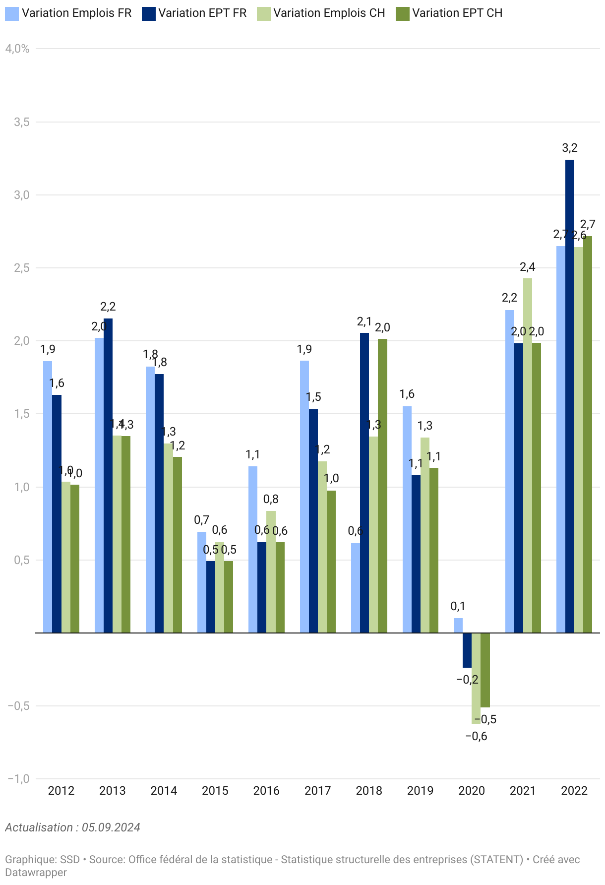En 2022, le canton de Fribourg a enregistré 164'322 emplois et 124'965 équivalents plein temps (EPT). Par rapport à 2021, cela représente une augmentation de 3925 EPT, soit une hausse de 3,2%. Il s'agit de la plus forte progression annuelle enregistrée depuis la création de cette statistique en 2011. Cette croissance dépasse également la moyenne des cantons, qui s'établit à 2,7%. En termes de variation annuelle des EPT, le canton de Fribourg se positionne à la 10ème place du classement. En tête, on trouve le canton du Jura (+6,0%), suivi de près par le canton de Zoug (+5,8%) et le canton de Neuchâtel (+4,1%) qui occupe la troisième place.