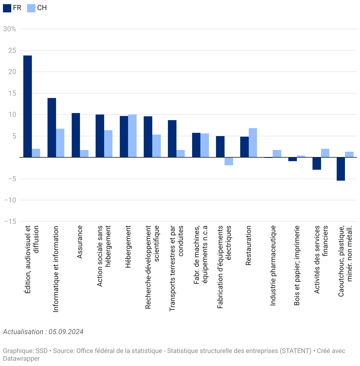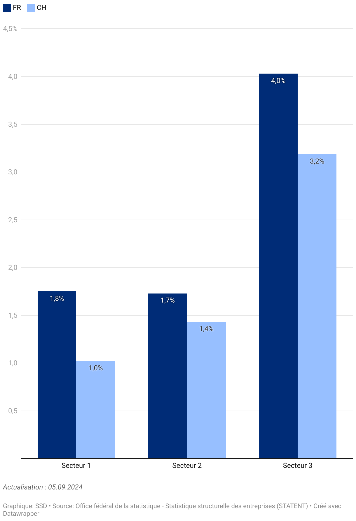 Le dynamisme de Fribourg se reflète aussi dans le nombre d'établissements : le canton comptait désormais 23'697 établissements, soit 498 unités supplémentaires par rapport à 2021, marquant une croissance de 2,2%. Ce taux dépasse celui de l'ensemble de la Suisse, qui a enregistré une augmentation de 1,6% (+11’006 unités).