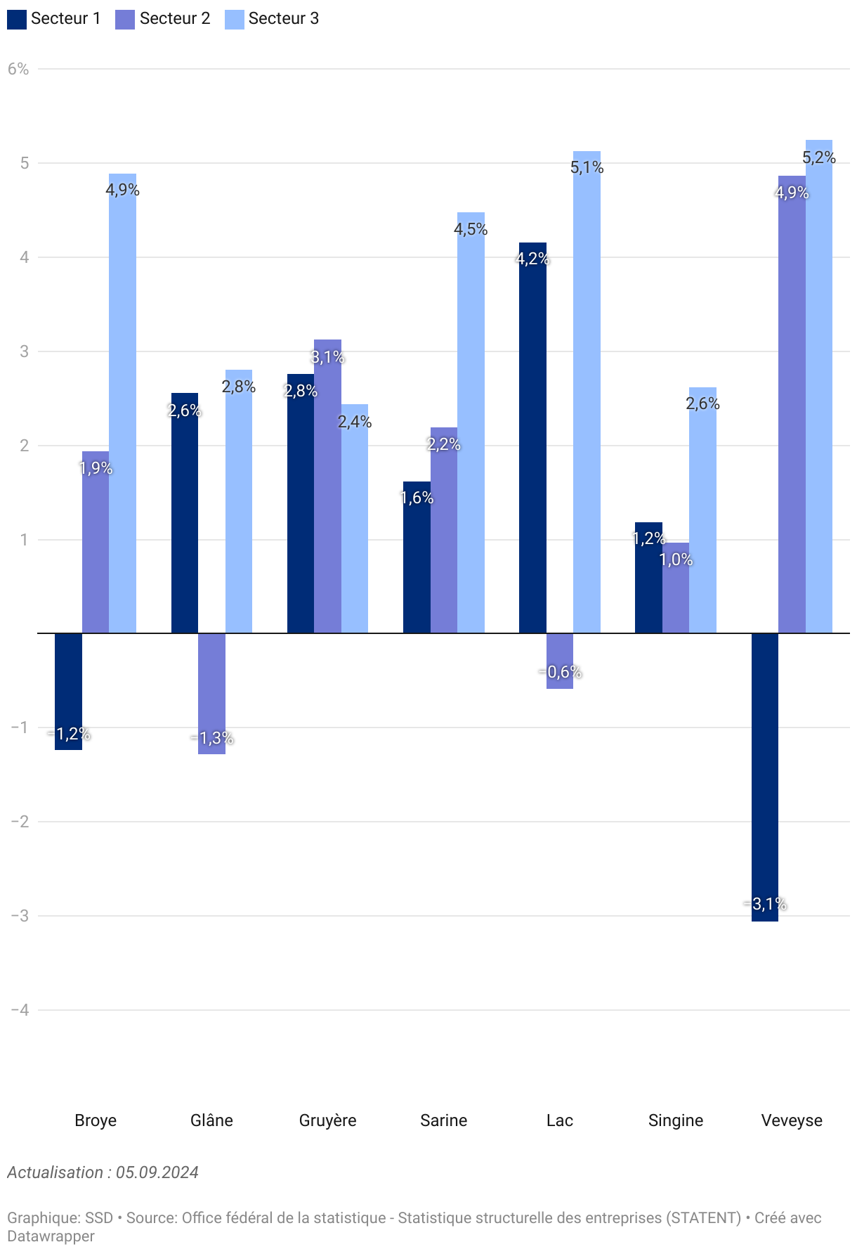 En 2022, les emplois en équivalents plein temps (EPT) ont augmenté dans tous les districts. Le district de la Veveyse se distingue avec la plus forte croissance, affichant une hausse de +4,5% (+234 EPT), suivi de près par la Sarine, qui enregistre une progression de +4,0% (+2177 EPT). Les districts de la Broye (+3,3% ; +287 EPT), du Lac (+2,8% ; +365 EPT) et de la Gruyère (+2,7% ; +615 EPT) montrent également des augmentations notables. En bas du classement, on retrouve la Singine avec une croissance de +1,9% (+225 EPT) et la Glâne, qui ferme la marche avec +1,1% (+82 EPT). À noter qu’en 2021, c’est la Gruyère qui avait enregistré la plus forte progression, tandis que la Singine était déjà le district le moins dynamique.