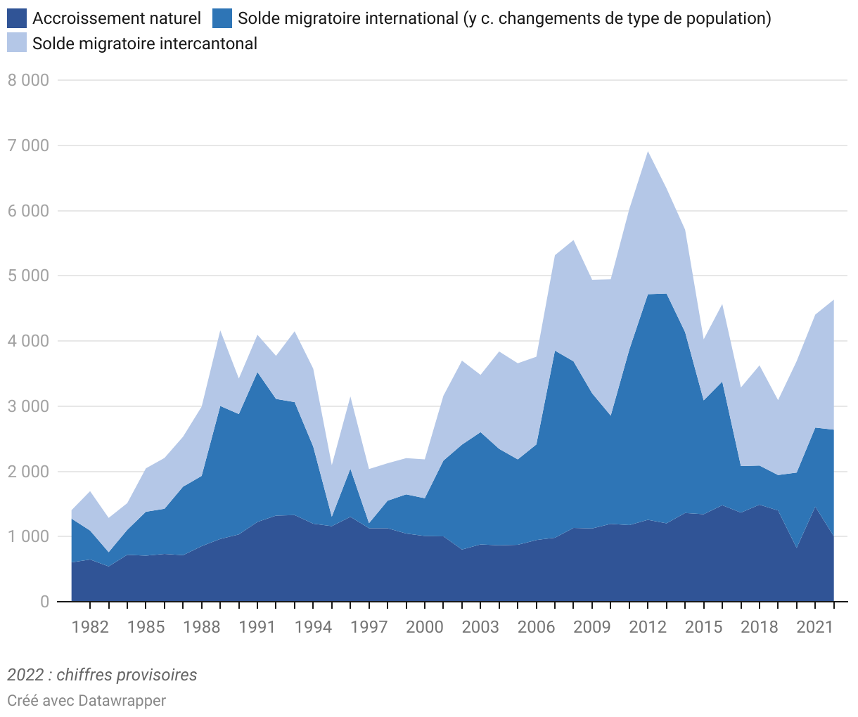 La croissance démographique 2022 du canton (+4'500), s’explique principalement par un solde migratoire (arrivée-départ) élevé, + 3'600 habitants environ dont un peu plus de la moitié (55%) en provenance d’autres cantons et le reste (45%) de l’étranger. Les naissances retrouvent les valeurs des années d’avant COVID-19 (+3'500) alors que les décès ont été élevés en 2022 avec plus de 2'400 personnes.