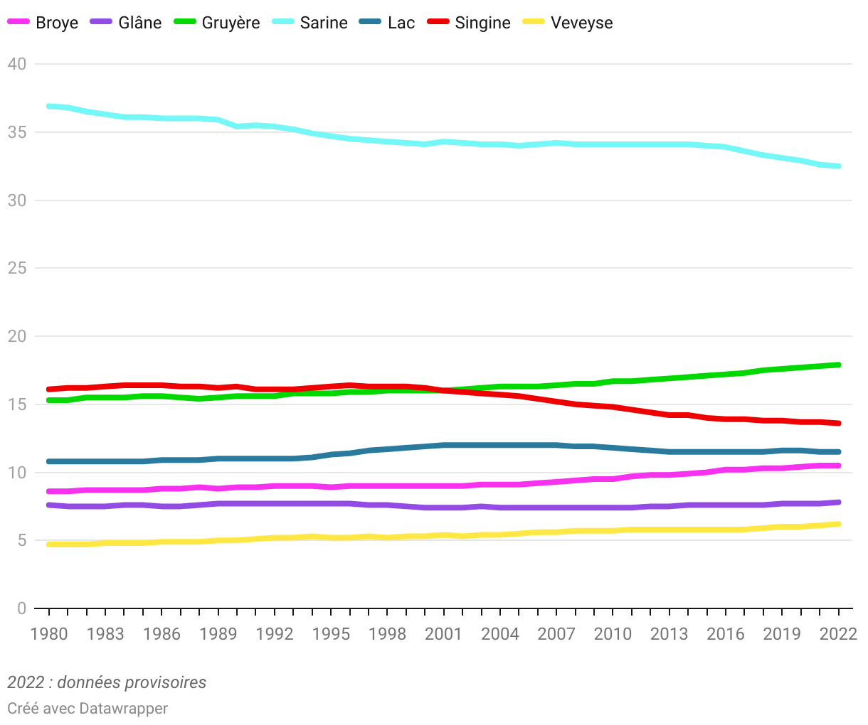 Sur la base des dernières données démographiques publiées par l’OFS, de nouvelles dynamiques de population encore peu marquées en 2022 se confirment au niveau de certains districts. Si l’on compare l’évolution de la part des districts dans le canton, la Singine semble avoir enrayé sa baisse, avec un solde migratoire et des naissances en hausse alors que la Sarine, district le plus peuplé, voit sa part encore légèrement diminuer, solde migratoire et nombre de naissances étant en baisse. Les autres districts poursuivent les tendances déjà identifiées lors de la publication des scénarios 2023-2050. Les projections de population actualisées sont maintenant disponibles.