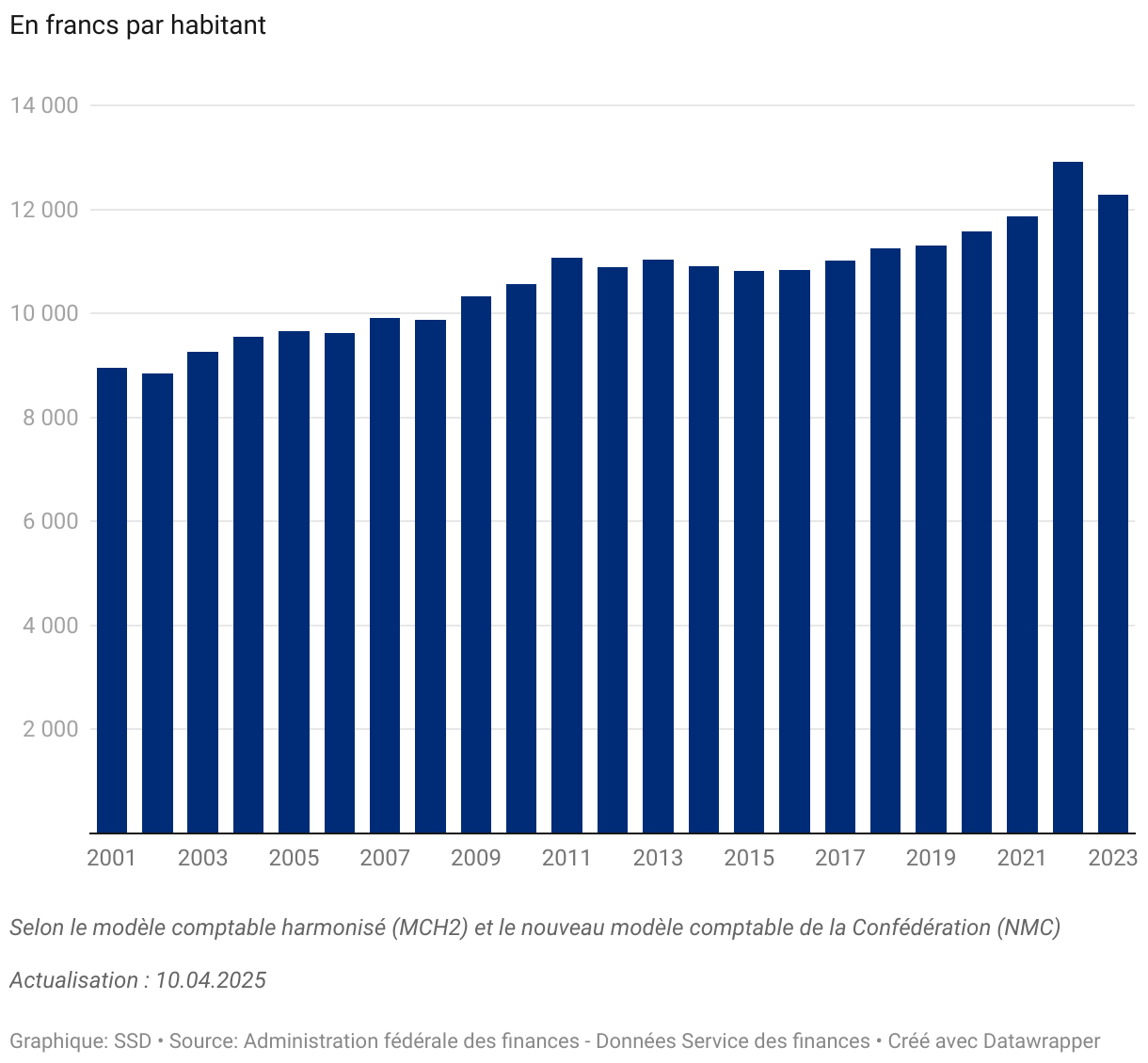 En 2023, le canton de Fribourg a présenté des dépenses moyennes de 12'288 francs par habitant selon le modèle comptable harmonisé (MCH2) et le nouveau modèle comptable de la Confédération (NMC). Cette valeur cantonale est supérieure de 1,2% à la moyenne suisse, établie quant à elle à 12'146 francs par habitant. Par rapport à l'année précédente, une baisse de 618 francs par habitant a été constatée dans notre canton, ce qui représente une régression de 4,8% entre 2022 et 2023. Sur le long terme, la tendance observée est ascendante, comme en témoigne le graphique.
