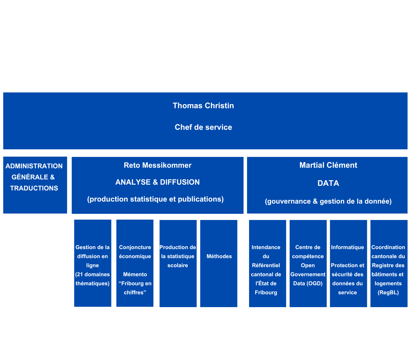 Accueil Direction de l’économie, de l’emploi et de la formation professionnelle Service de la statistique et de la donnée Organigramme du Service de la statistique et de la donnée du canton de Fribourg Organigramme du Service de la statistique et de la donnée du canton de Fribourg Chapeau Explorez la structure de notre organisation à travers cet organigramme. Agrandir Organigramme du Service de la statistique et de la donnée SSD © Etat de Fribourg - Staat Freiburg Image principale Amt für Statistik und Daten © Tous droits réservés Service de la statistique et de la donnée Calculateur des salaires Conjoncture fribourgeoise Production, commandes, chiffres d'affaires Publications du Service de la statistique et de la donnée du canton de Fribourg Statistiques par thèmes Page liée Service de la statistique et de la donnée (SSD) Direction / Service propriétaire Service de la statistique et de la donnée Information de contact Publié par Service de la statistique et de la donnée Dernière modification : 31.01.2025 Partager sur :
