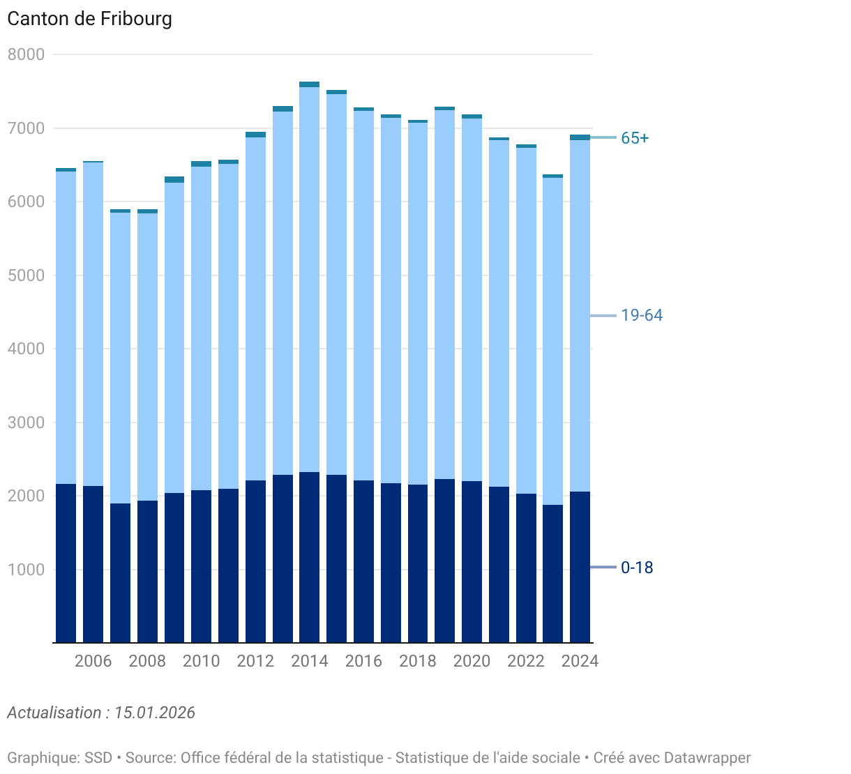 En 2024, le canton de Fribourg a enregistré 6905 bénéficiaires de l’aide sociale, en augmentation de 8,4% par rapport à l’année précédente (6370 bénéficiaires en 2023). Parmi ces bénéficiaires, 54,9% sont de nationalité étrangère, un chiffre supérieur à la moyenne nationale qui est de 52,1%. Les bénéficiaires de l’aide sociale âgés de moins de 18 ans représentent 2060 personnes, soit un peu moins d’un tiers (29,8%) du total des bénéficiaires en 2024. Ce taux est en légère diminution depuis le début de la série de donnée (33,3% en 2005), contrairement à la part des personnes âgées de 56 à 64 ans, qui est passée de 5,5% en 2005 à 12,3% en 2024.