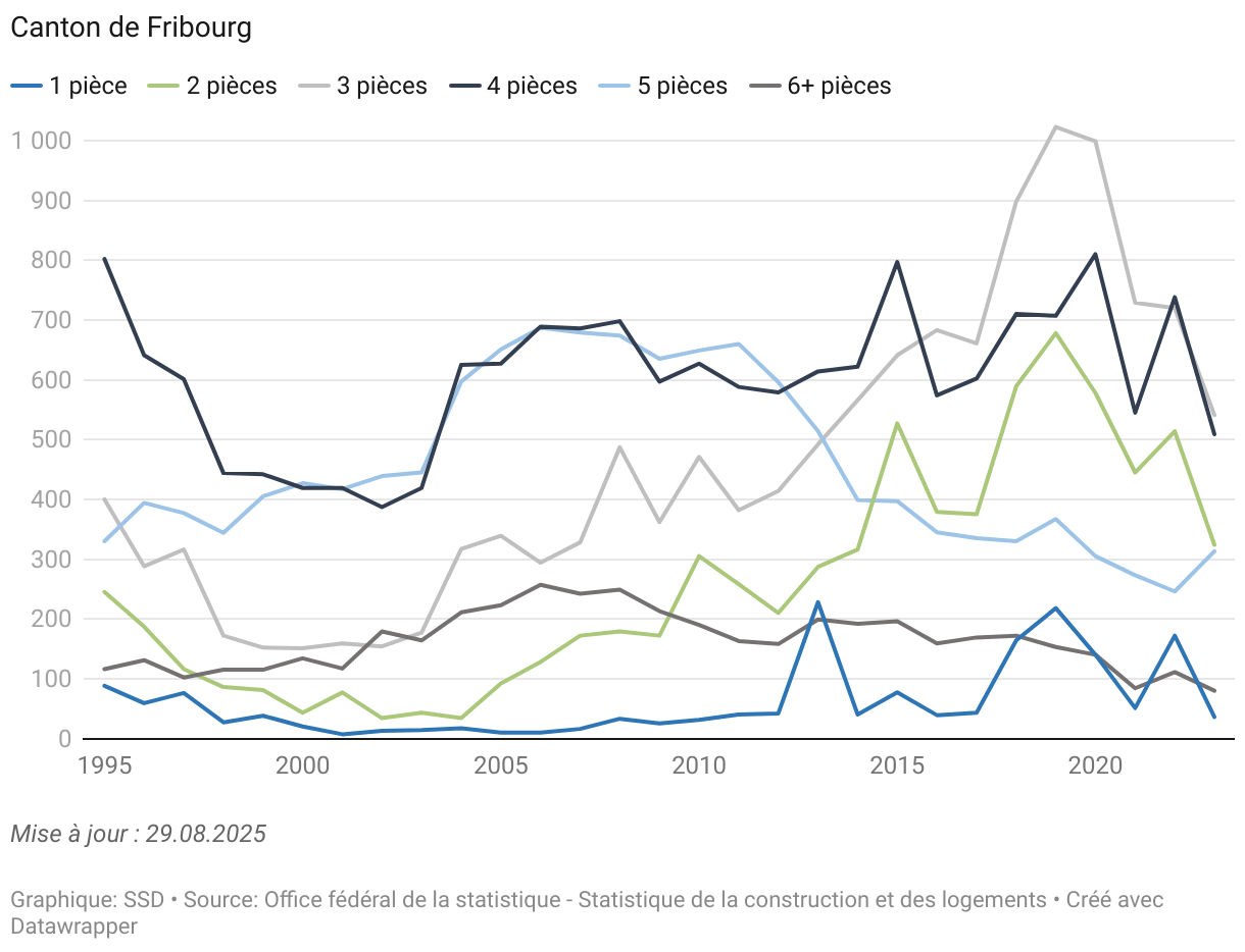 La production de logements dans les nouvelles constructions en 2023 dans le canton de Fribourg s’élève à 1803 unités et à 46'731 unités en Suisse.En 2023, l’indice de la production de logement du canton de Fribourg est inférieur de plus de 10 points à celui de la Suisse. Il faut remonter à la fin des années 1990 pour retrouver une telle situation. De 2006 à 2022, la croissance de la production de logements était très soutenue dans le canton de Fribourg (en moyenne 2350 nouvelles unités), pour la 1ère fois en 2023 elle est en baisse et se situe au même niveau que la production de 2004.Sur l’ensemble de la période, la construction de logements est dominée par les logements de 4 pièces, suivis des 3 pièces et des 5 pièces (à parts quasi égales), formant le cœur de la nouvelle offre résidentielle. Depuis 2014, la construction de logements de 3 pièces dépasse celle des 5 pièces et depuis 2016, avec un pic en 2019-2020, elle constitue la plus grande partie des logements nouvellement construits. La production de logements de 6 pièces et plus reste relativement stable avec une légère baisse depuis 2000.