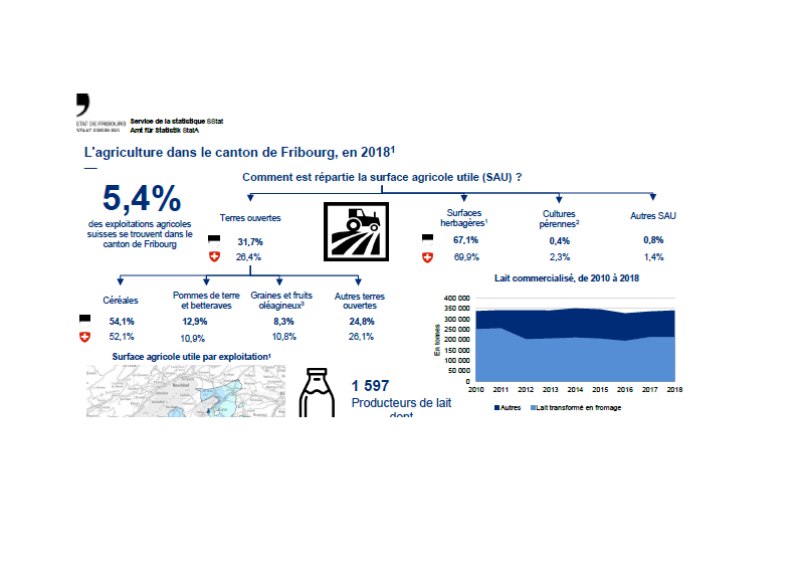 Avec 2'762 exploitations agricoles et 75'033 ha de surface agricole utile, le canton de Fribourg se place respectivement aux 7ème et 4ème rangs en comparaison nationale. En effet, 5,4% des exploitations agricoles suisses se trouvent sur sol fribourgeois. La surface agricole utile (SAU) est principalement repartie en surface herbagère (67,1% pour le canton de Fribourg contre 69,9% pour la Suisse, sans compter les alpages) et en terres ouvertes, champs labourés voués à la céréaliculture, aux légumineuses, aux plantes sarclées (betterave à sucre, pomme de terre), à certaines plantes industrielles et au tabac (31,7% pour le canton de Fribourg contre 26,4% pour la Suisse). On y cultive principalement des céréales (54,1% des terres ouvertes, contre 52,1% dans l’ensemble du pays), ainsi que des pommes de terre et des betteraves (12,9% contre 10,9% en moyenne nationale). La restructuration du secteur agricole est toujours d’actualité en Suisse, où la baisse du nombre d’exploitations en 2018 a dépassé celle de 2017. Dans le canton de Fribourg, on dénombre 78 exploitations de moins. Bien qu’encore inférieure à la moyenne suisse, la proportion des exploitations agricoles bio est à la hausse dans notre canton, atteignant 7,1% en 2018. Ces huit dernières années, la production animale a augmenté dans son ensemble, en particulier la production de volailles. La production de porcs est par contre à la baisse, alors que celle des bovins reste stable. On compte 1'597 producteurs de lait dans le canton en 2018 (-2,7% par rapport à 2017). La part de lait transformé en fromage correspond à 62,3% du lait commercialisé. Le poids du secteur agricole dans le canton de Fribourg se remarque aussi dans la part des emplois dans l’agriculture, qui s’élève à 5,1% des emplois totaux, une proportion qui n’est que de 2,4% au niveau suisse. Le pourcentage de personnes actives dans l’agriculture ayant achevées une formation du degré tertiaire est légèrement plus haut (29,5%) que la moyenne nationale (26,4%). Avec le développement de l’institut agricole de Grangeneuve, ce pourcentage devrait continuer à augmenter. Dans le canton de Fribourg, le secteur agricole est à l’origine du développement d’une importante filière agro-alimentaire qui, avec l’agriculture, l’industrie, le commerce et la restauration, occupe aujourd’hui près de 20% des emplois. Ce sera le thème d’une prochaine communication.