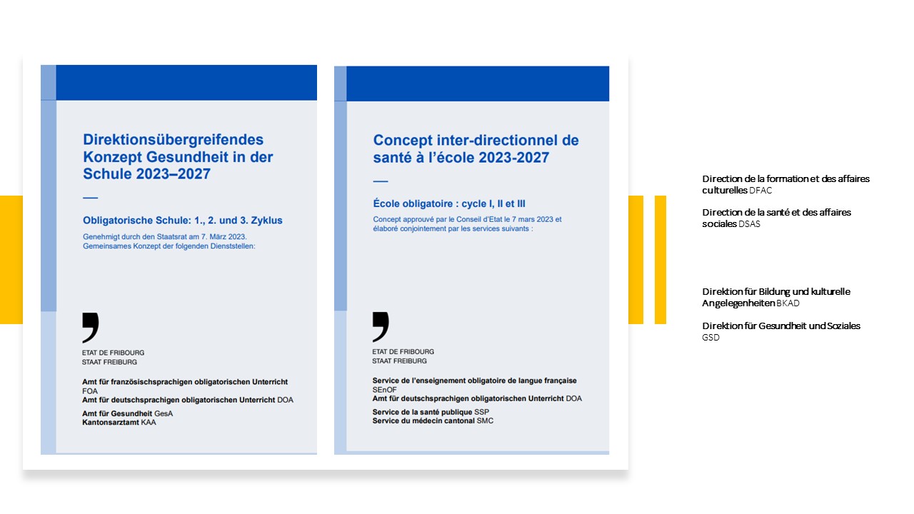 Le concept inter-directionnel de santé à l’école a été élaboré en 2008 par le Service de la santé publique (SSP), le Service du médecin cantonal (SMC) et par les Services de l’enseignement obligatoire de langue française (SEnOF) et de langue allemande (DOA). Il a été révisé une première fois en 2013 et prolongé en 2017 et en 2022. Il est arrivé à échéance fin 2022 ou jusqu’à l’approbation d’un nouveau concept. Une démarche de révision du concept a donc été menée, avec pour objectif d’y intégrer les enjeux transversaux que sont la durabilité et les changements climatiques. Le concept révisé s’insère dans une continuité avec l’ancien concept en ce qui concerne sa vision et ses objectifs. Le pilotage de la promotion de la santé et la prévention à l’école (facteur essentiel pour garantir l’implémentation du concept et son succès) est assuré par le bureau inter-directions « santé à l'école ».