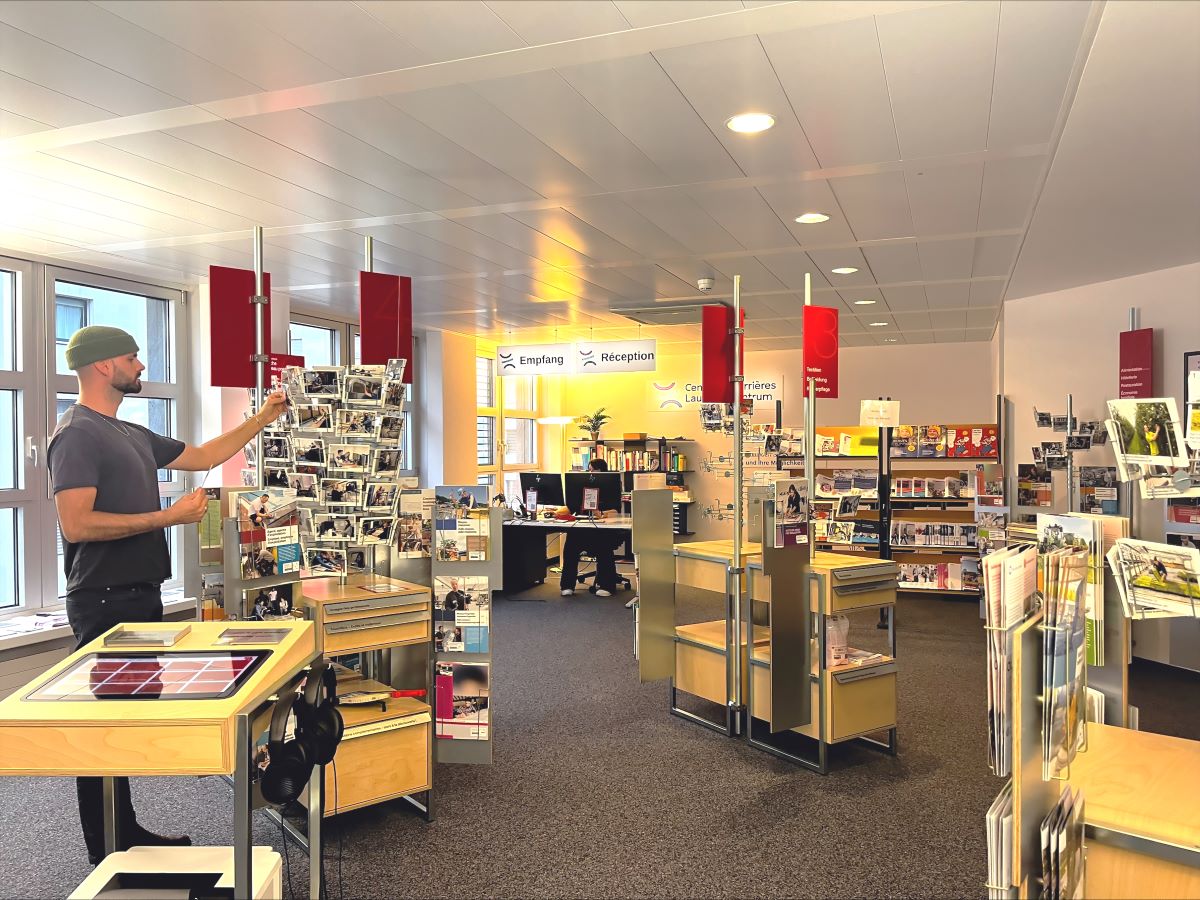 Les visiteuses et visiteurs peuvent trouver des réponses à leurs questions en naviguant entre de la documentation physique, des outils professionnels, mais aussi des informations numériques, qu’il s’agisse de vidéos, de jeux, d’informations sur les compétences à maîtriser pour chaque métier, de témoignages de professionnel-le-s, etc.
