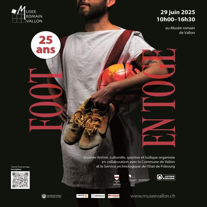 Les personnes intéressées à participer à ce tournoi pas comme les autres peuvent s’inscrire sur le site du musée (3 joueurs/joueuses, pas de gardien·ne, matchs de 12 minutes) : Le Musée romain de Vallon I Spécial anniversaire – 29 juin 2025 FOOT EN TOGE