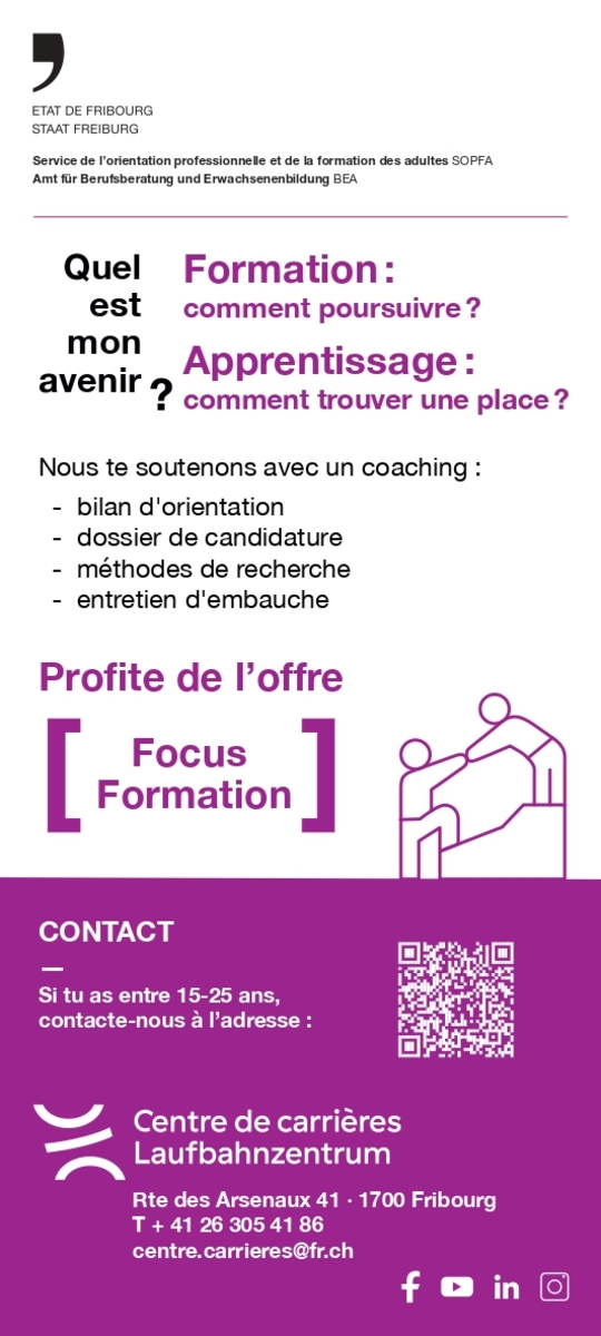 Si l'offre t'intéresse, prends rendez-vous à l'adresse : centre.carrieres@fr.ch
