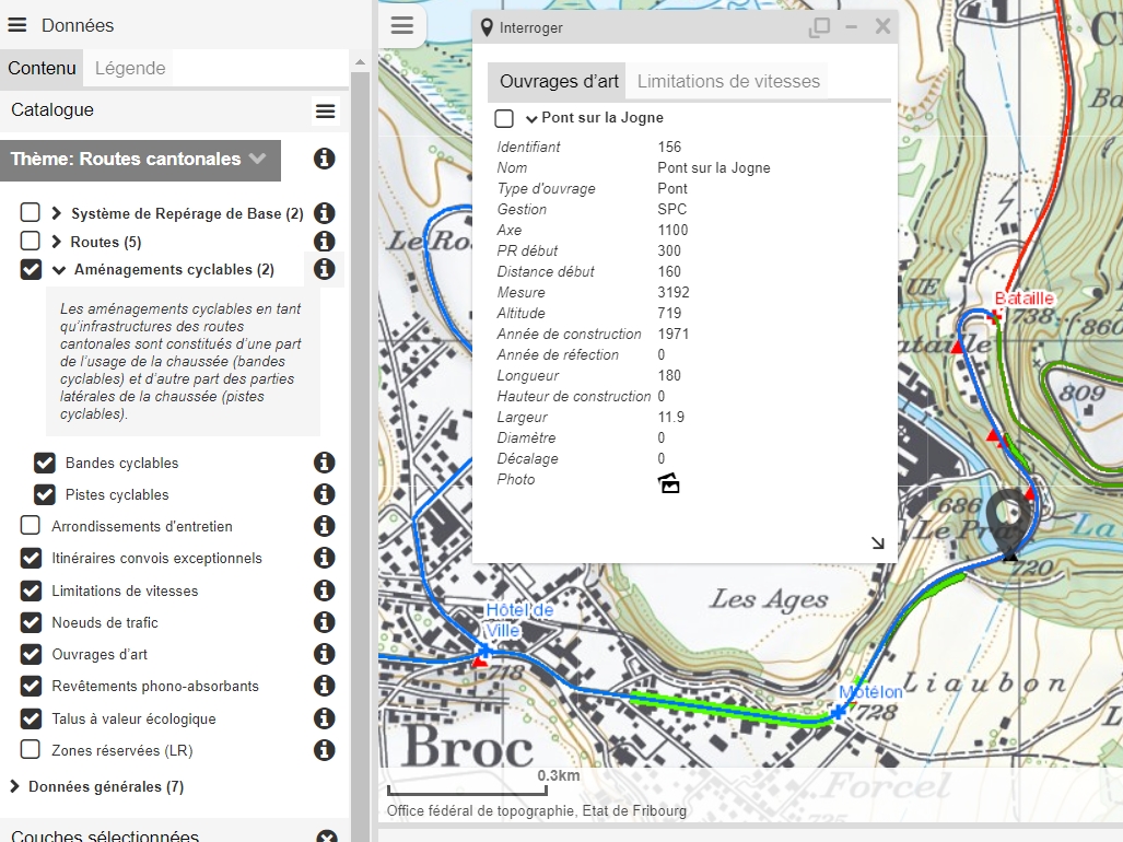 Le thème "Routes cantonales" du portail cartographique du canton de Fribourg regroupe les infrastructures sur routes cantonales, essentiellement de la Section projets routiers (PRo) et de la Section entretien des routes (ERo). En plus des données essentielles déjà présentes depuis début 2016 comme le Système de Repérage de Base (axes et points de repère), la classification des routes cantonales selon le propriétaire ou lois et les zones réservées, les couches suivantes sont désormais consultables:
