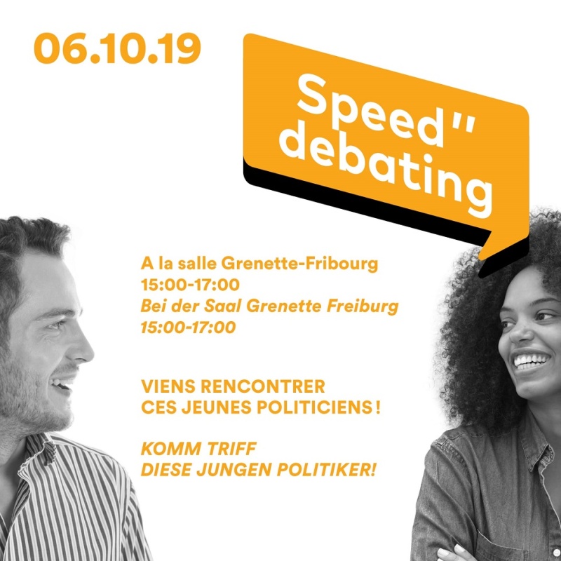 Fort du succès des éditions 2017 et 2018, le Conseil des Jeunes du canton de Fribourg organise une nouvelle édition de « Speed debating ». Celle-ci se déroulera le dimanche 6 octobre 2019, de 15h à 17h, à la salle de la Grenette (restaurant Punkt), à Fribourg. Elle permettra aux jeunes fribourgeois-e-s de croiser le fer avec de jeunes politicien-ne-s présent-e-s sur les listes électorales.
