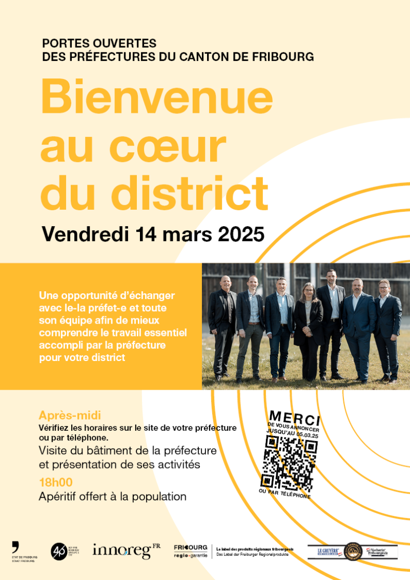 La Conférence des préfets du canton de Fribourg lance ce concept «Bienvenue au cœur du district» pour aller à la rencontre des citoyen-nes. Un programme enrichissant et convivial sera proposé le 14 mars en fin de journée, dans les Préfectures des sept districts. Après une visite des bâtiments, habituellement fermés au public, la présentation des activités et la partie officielle, les participant-es seront invité-es à partager un apéritif (sur inscription) qui mettra à l’honneur de nombreux produits du terroir.