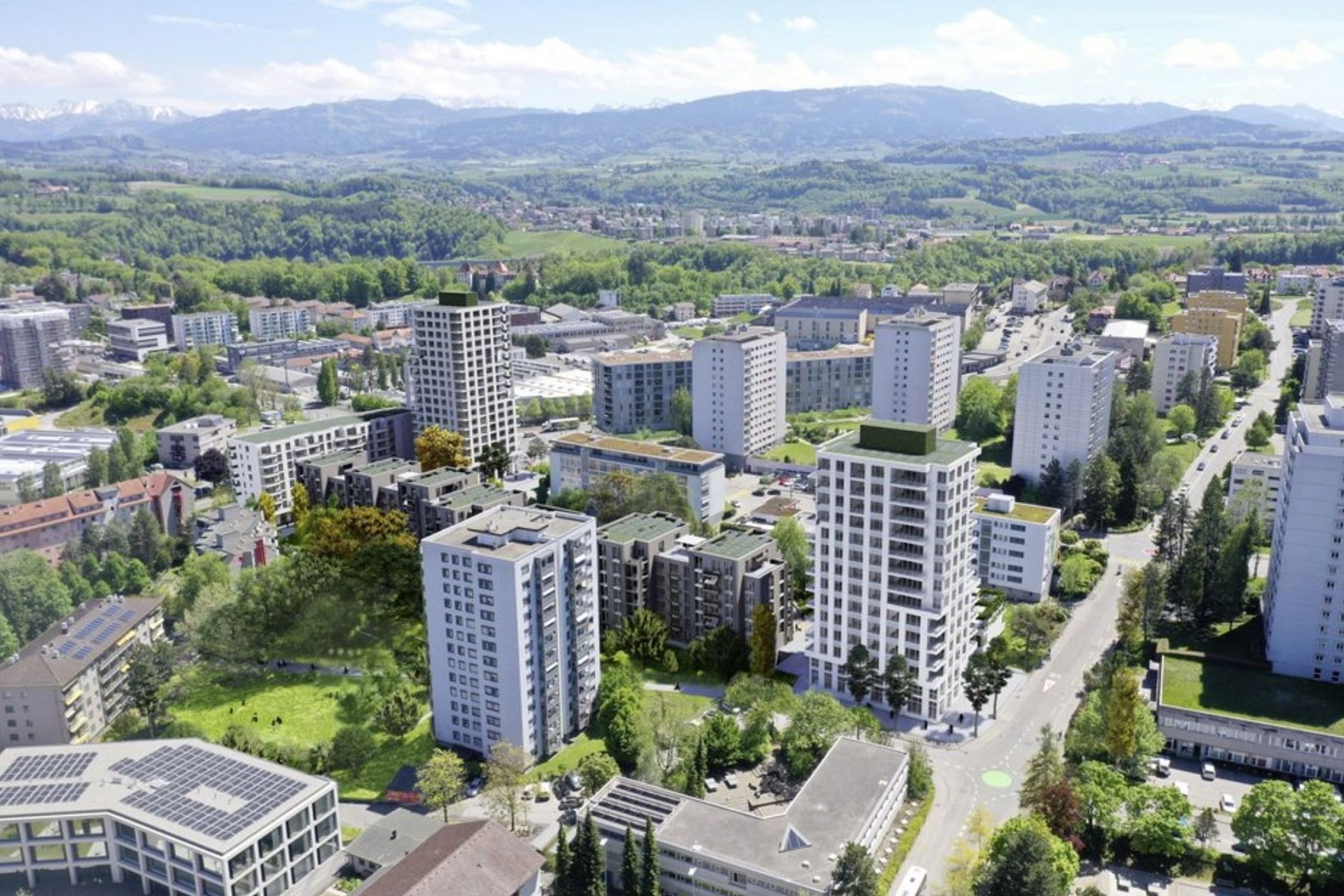Situé à 800 mètres de la gare de Fribourg, ce nouveau quartier, situé dans l’ancien vallon du ruisseau de Pérolles, s’insérera dans un vaste parc arborisé. Le complexe d’habitations collectives, comprenant deux tours, permettra la réalisation de 350 logements.