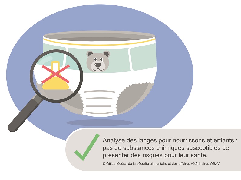 Plus de vingt échantillons de langes pour nourrissons et enfants en bas âge vendus sur le marché suisse ont été examinés. Au vu des analyses effectuées, et en l’état des connaissances actuelles, l’Office fédéral de la sécurité alimentaire et des affaires vétérinaires OSAV considère que les langes ne contiennent pas de substances chimiques susceptibles de présenter des risques pour la santé des nourrissons et des enfants en bas âge.