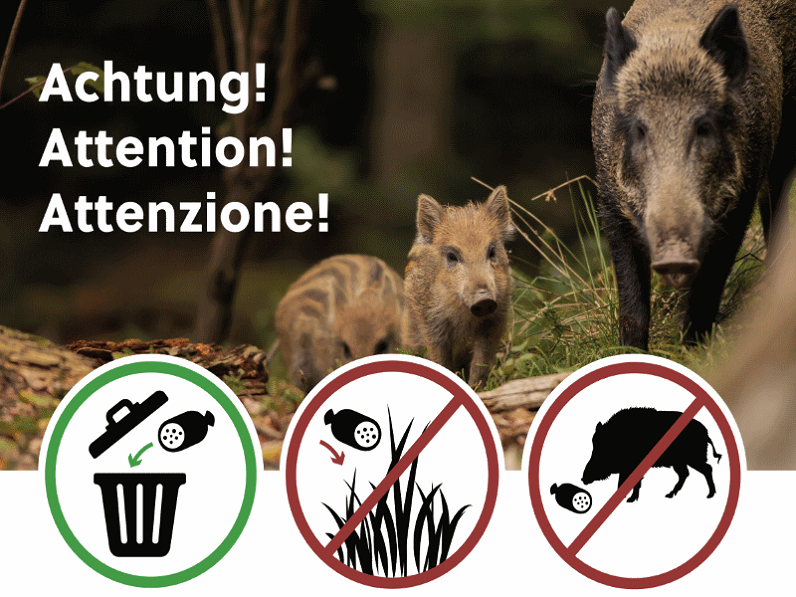 Les voyageurs jouent donc un rôle important pour prévenir l’apparition de la peste porcine africaine en Suisse. En renonçant à ramener des produits contenant de la viande de porc ou de sanglier issue des pays touchés par la PPA, ou en les éliminant de façon sécurisée, vous contribuez à préserver l’élevage porcin en Suisse.