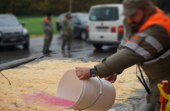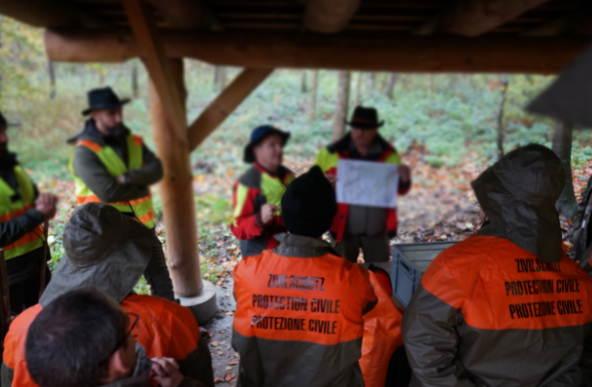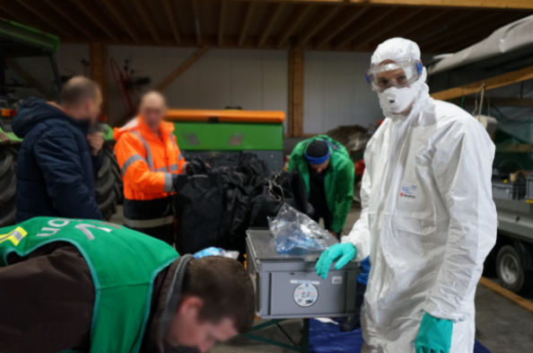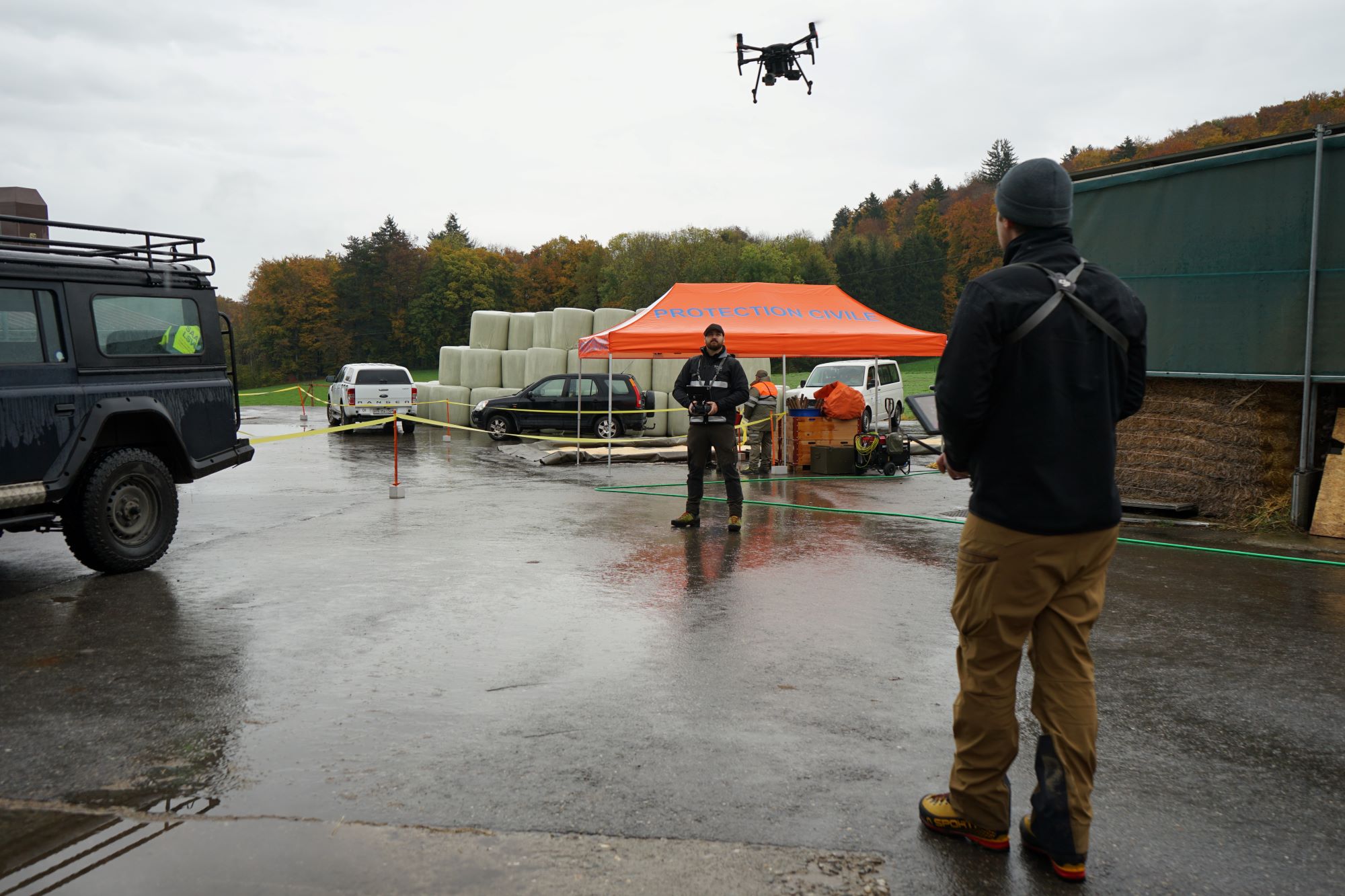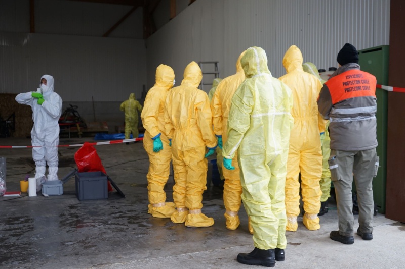 L'équipe d'intervention en cas d'épizootie comprend entre autres des experts et vétérinaires officiels du SAAV, le Service et des forêts et de la nature, la Protection civile, SANIMA, la police ainsi qu'un agriculteur qui a généreusement mis à disposition son exploitation pour la journée. Après avoir pris connaissance du scénario donné, les équipes se sont divisées en pôle de compétence. Certains ont bouclé l'exploitation agricole, d'autres survolaient à l'aide d'un drone la forêt pour détecter des mouvements d’animaux sauvages ou localiser un cadavre, une battue silencieuse a été organisée également dans la forêt.