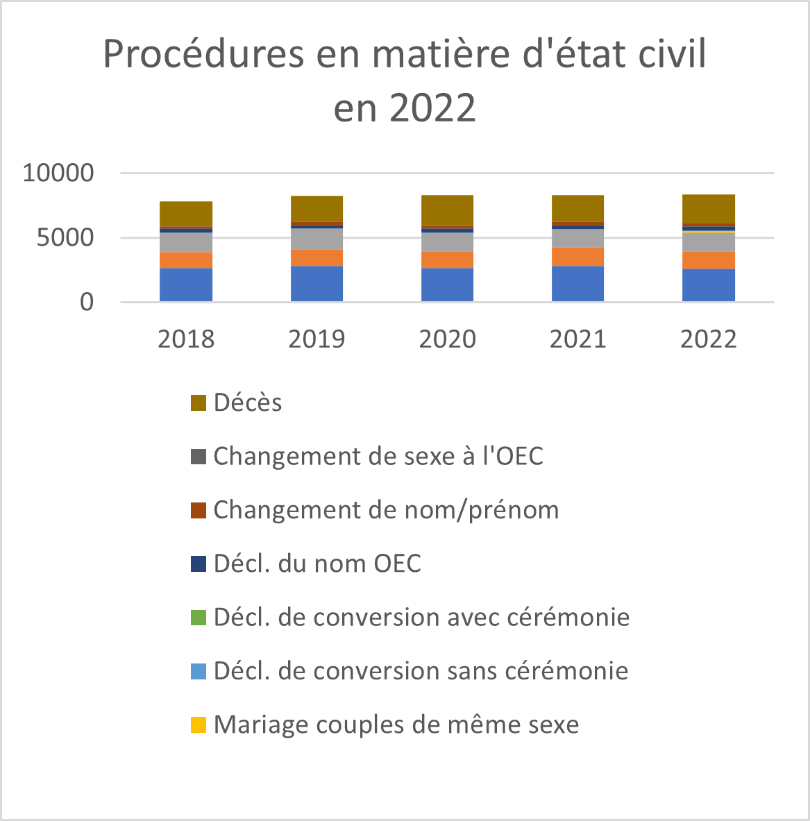 Sous l’angle de l’état civil, l’année 2023 a été une année de continuité avec la consolidation de la mise en œuvre du « mariage pour tous » ainsi que du « changement de sexe devant l’officier/ère de l’état civil », ceci avant l’apparition en 2024 de modifications majeures qui toucheront l’ensemble des officiers et officières du canton avec l’introduction à la fin de 2024 d’un nouveau registre informatisé de l’état civil « Infostar NG ». Le SAINEC a également réalisé quelques travaux préparatoires en vue de la probable prochaine modification du Code civil en matière de droit du nom des conjoints et des enfants. Enfin, il a également mis en place un programme de formation interne pour les nombreuses nouvelles officières de l’état civil.