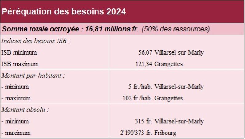 Le montant de la péréquation des besoins à charge de l'Etat est fixé à 50% de celui des ressources, soit 16'806'553 francs. L’augmentation par rapport au montant de la péréquation des besoins 2023 est de 776'496 francs, soit une augmentation relative dans la même proportion que celle des ressources (+4,84%). Toutes les communes en bénéficient.