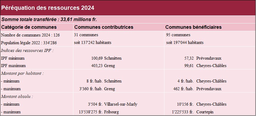 Dans l’instrument des ressources, il est constaté que les communes de Fräschels et Morlon, bénéficiaires en 2023, deviennent contributrices en 2024 ; il n’y a pas de changement dans le sens inverse.