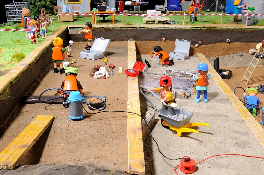 - Atelier «chantier de fouille» sur une maquette de chantier archéologique réalisée avec des figurines Playmobil.