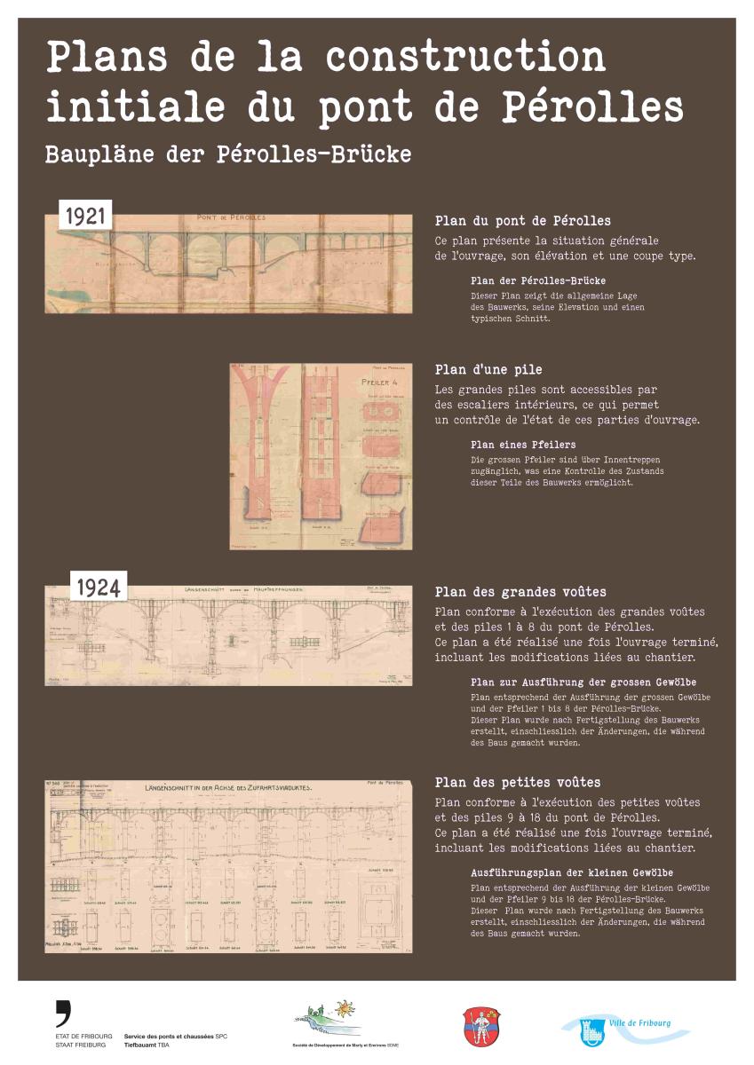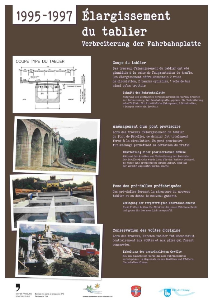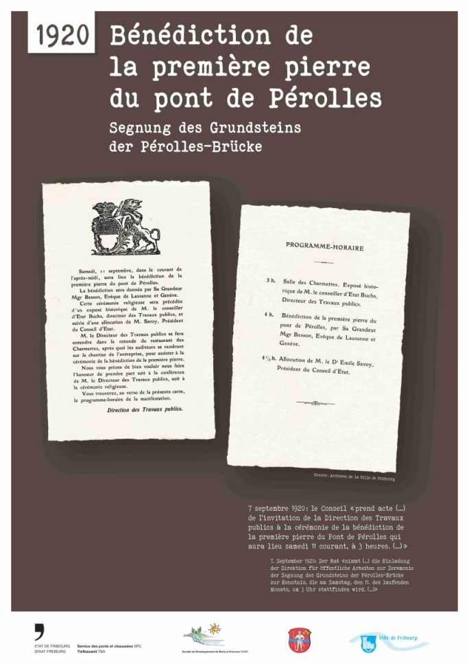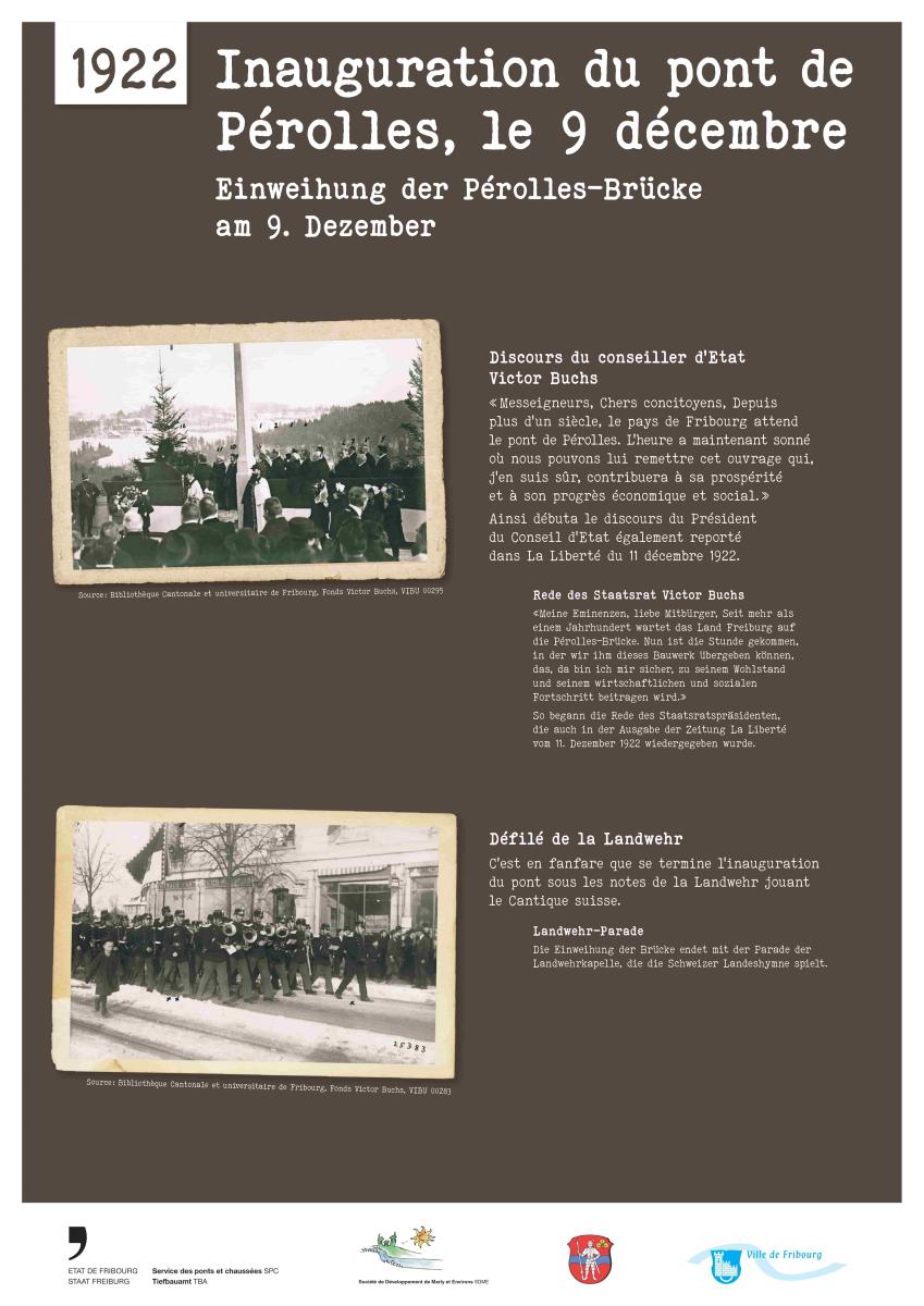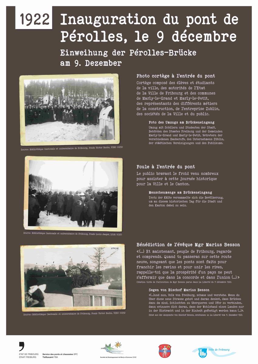 Lorsque cet impressionnant pont a été mis en service en 1922, il était, avec ses quelques 555 mètres, le plus long de Suisse. Il a été utilisé en premier lieu par des piétons, des charriots, des charrettes et des vélos, les véhicules à moteur étant encore rares à l'époque. L'annuaire statistique montre qu'en 1922, le canton de Fribourg comptait 580 voitures, 158 camions, 417 motos et 79 motos avec side-car. Dans toute la Suisse, il n'y avait que 35'000 véhicules à moteur. Les vélos étaient dix fois plus nombreux. Les comptages de trafic de l'époque mettent également en évidence que les trois quarts de tous les mouvements de trafic étaient dus aux vélos. Le pont de Pérolles – il faut le souligner – était donc à l'époque avant tout un pont pour les vélos.