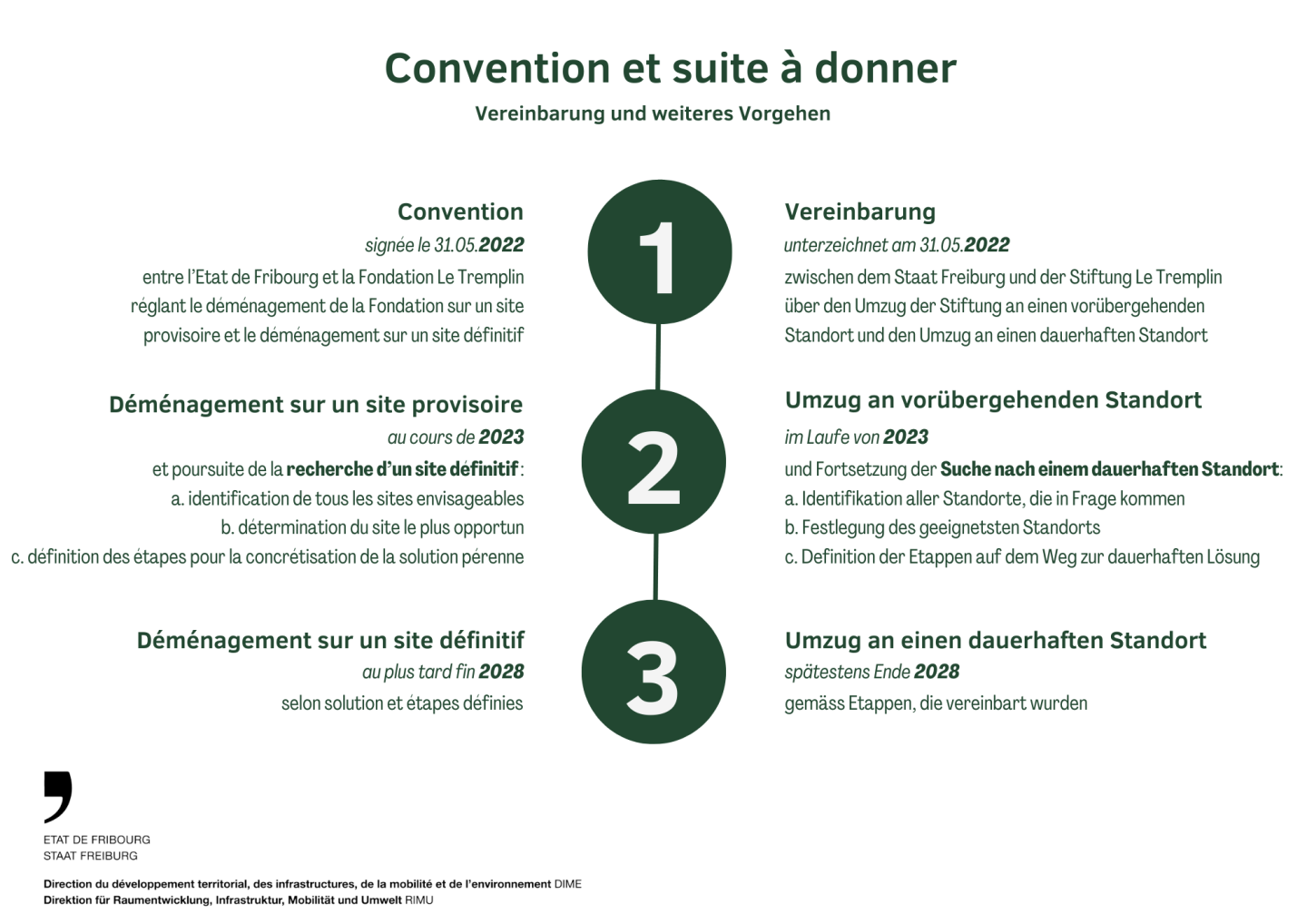 La convention prévoit que la Fondation Le Tremplin déménage dans la deuxième moitié de 2023 à la Route des Arsenaux 16, où elle devrait rester jusqu'à fin 2028. L'Etat de Fribourg et la Fondation travaillent ensemble à la recherche d'un site définitif. Les coûts de la réalisation de la solution intermédiaire sont en cours d’étude. Après 2028, le site d’Arsenaux 16 pourra être temporairement utilisé pour d’autres locaux de l’Etat au titre de bâtiment rocade, ceci en attendant sa démolition future.