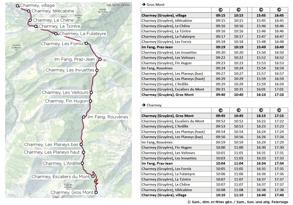 Le minibus assurera la liaison entre Charmey et le parking du Haut-du-Mont entre le 10 septembre et le 30 octobre. Il partira de l’arrêt Charmey, village chaque samedi et dimanche à 9h15, 10h15, 15h45 et 16h45. Les retours depuis le Haut-du-Mont sont prévus aux mêmes dates, à 9h45, 10h45, 16h15 et 17h15. Plusieurs autres arrêts sur demande au départ de sentiers pédestres seront desservis sur le trajet, ce qui offre des possibilités d’itinéraires sur la vallée du Motélon, voire l’Intyamon par le Plan Tissiniva. La buvette des Invuettes sera également desservie.