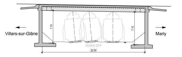 Le pont CFF date de 1948 et permet à la route cantonale de franchir 3 voies de chemin de fer. Il se trouve dans un état de dégradation avancé, une restriction de charge à 21 tonnes est d’ailleurs en vigueur pour des raisons de sécurité. Les CFF ont imposé le rehaussement de la route d’environ 1 mètre, afin d’agrandir le gabarit d’espace libre sous l’ouvrage. Le projet prévoit de construire un pont intégral, c’est-à-dire sans appuis mécaniques ni joints de chaussée. Cette méthode de construction offre un net avantage en termes de durabilité, de coûts d’entretien et de protection contre le bruit. Un dispositif de retenue pour empêcher la chute d’un véhicule sur les voies CFF et des protections au toucher des lignes de contact seront également installés.