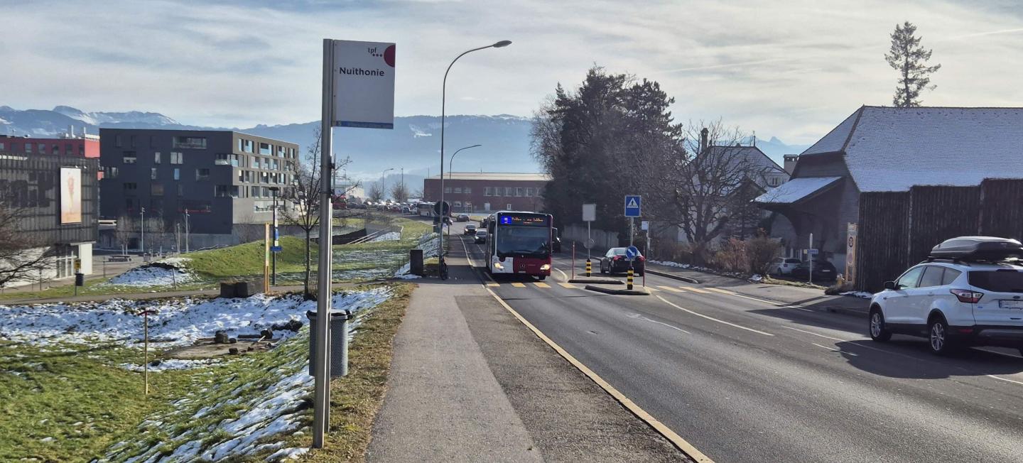 Le projet comprend l’aménagement de l’arrêt de bus Nuithonie dans les deux sens, avec mise en conformité avec la Loi sur l’égalité pour les handicapés (LHand), et une voie de bus à l’approche du giratoire de La Berra. Il inclue également une piste mixte piéton/vélos, une bande cyclable ainsi qu’un accrochage direct à la place arborée devant Nuithonie et à la TransAgglo. Enfin, le projet comprend également des espaces végétalisés et arborés ainsi que l’éclairage et du mobilier urbain.