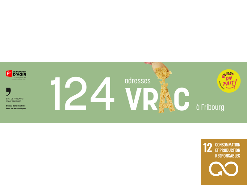 Mais où acheter en vrac ? L’annuaire pour les achats en vrac de la Fédération romande des consommateurs (FRC) , actuellement promu dans tous les transports publics fribourgeois, répertorie de nombreuses bonnes adresses pour le canton de Fribourg. Cet annuaire, ainsi que les annuaires de la réutilisation et de la réparation, sont développés en collaboration avec le Bureau de la durabilité (BuD). Grâce à la contribution du BuD et de bénévoles, ils sont régulièrement actualisés et enrichis.