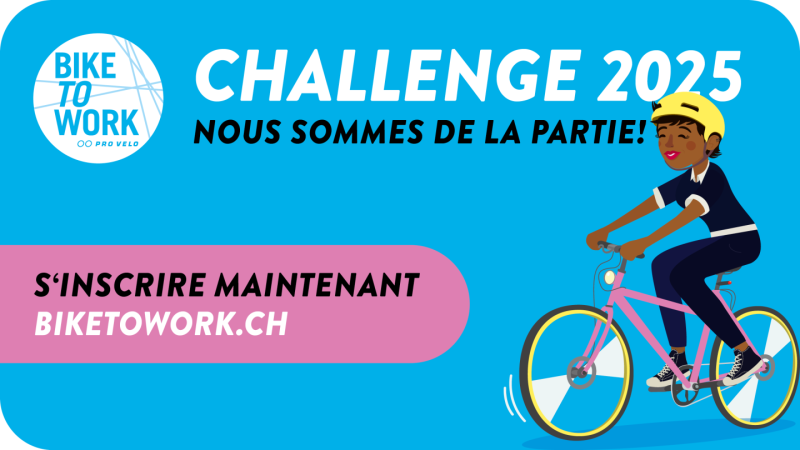 Organisée par PRO VELO Suisse, l’action nationale Bike to Work met en lumière la mobilité douce et renforce la forme physique et l’esprit d’équipe des collaboratrices et des collaborateurs. Durant les mois de mai et/ou juin, formez votre équipe de maximum quatre personnes, enfourchez votre vélo au moins un jour sur deux et effectuez le plus possible de trajets professionnels à vélo. Il est possible qu’un membre de l’équipe fasse les trajets à pied, voire à rollers ou trottinette ! Enregistrez ensuite en ligne vos kilomètres parcourus dans un calendrier d’action, et cela peut se faire également pour les jours de télétravail. Finalement vous aurez peut-être la chance de gagner des prix pour une valeur de CHF 130'000.