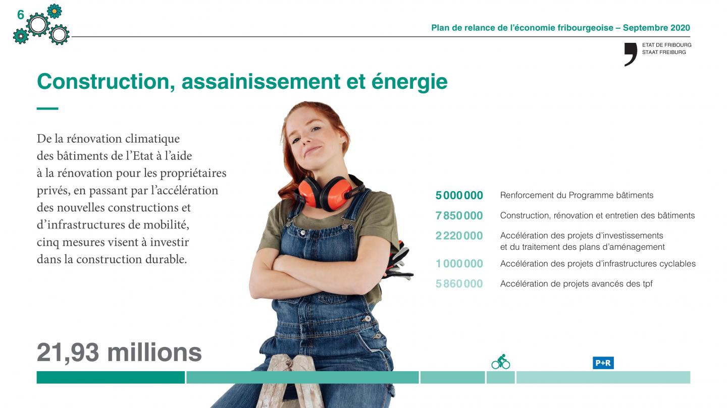 - Description de la mesure : le Programme bâtiments du canton de Fribourg est en vigueur depuis 2017 et comprend treize mesures d’encouragement destinées à la rénovation des bâtiments et au remplacement des installations de chauffages à énergies fossiles par des énergies renouvelables. Dans son état actuel, le Programme Bâtiments génère des investissements directs pour un montant total de 115 millions de francs par an. En augmentant d’au moins 50% les taux de subvention pour les treize mesures en vigueur, la branche de la construction (particulièrement active dans le canton) verra une augmentation sensible des commandes de travaux. De plus, cette mesure destinée à un très large public de propriétaires correspond aux objectifs de politique énergétique et de la politique climatique menées par l’Etat, puisqu’elle permettra la réduction sensible des émissions de CO2. Le financement du programme est assuré pour un tiers par le canton et deux tiers par la Confédération. L’effet multiplicateur de la mesure en est par conséquent d’autant plus intéressant.