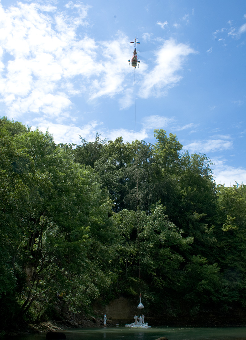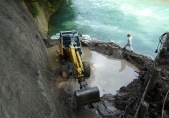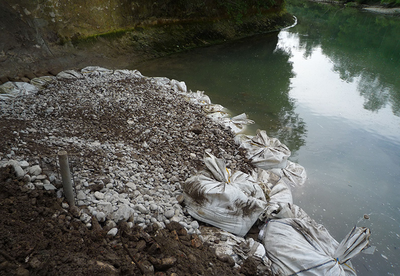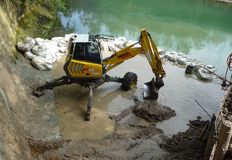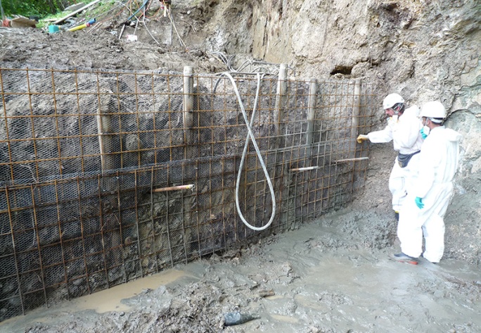 - Construction de deux parois de soutènement avec pieux forés dans la molasse (amont, en prolongement du tuf et latérale vers le sud, contre la décharge)