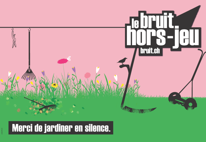 Dans le cadre de la Journée contre le bruit du 27 avril 2022, une journée de jardinage sans bruit est instaurée dans toute la Suisse. Lors de cette journée, qui se tiendra le 30 avril 2022, il s’agira de mettre en pause tous les engins de jardinage à moteur, selon l’adage « Des muscles plutôt que des moteurs ». En effet, dans le jardin, presque tous les travaux peuvent se faire sans problème à la main, et donc de façon silencieuse et respectueuse de l’environnement. Des affiches ont été créées pour la campagne. Les communes, les associations et les particuliers intéressés peuvent commander le matériel de campagne sous www.bruit.ch/2022 .
