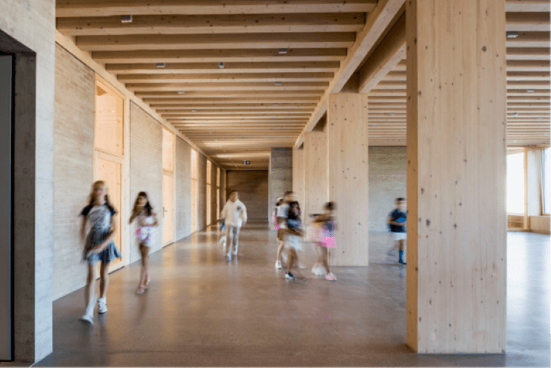 Inauguré en 2024, l’ensemble du site comprenant une école primaire et enfantine, ainsi qu’une salle de sport double a été certifié Minergie A-P-eco grâce à sa structure en bois local, ses briques d’argile et ses panneaux solaires.